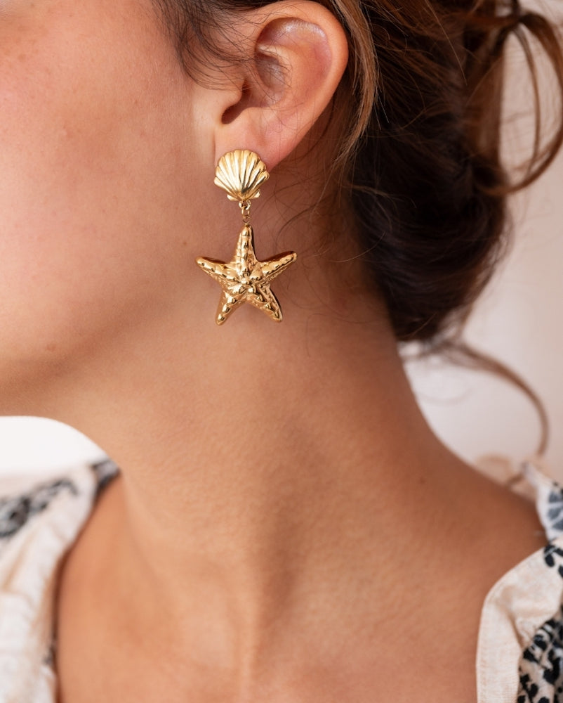 Découvrez nos boucles d'oreilles étoile de mer en lien avec l'univers marin. Un coquillage présent au début de la boucle.