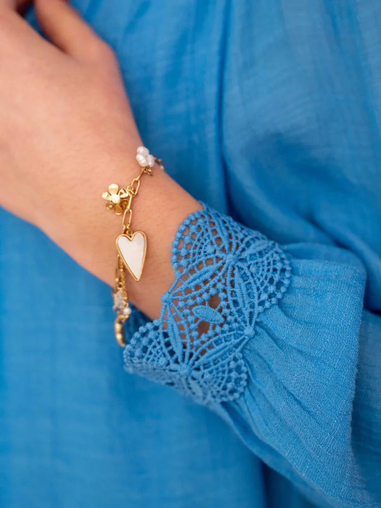 Un éclat doré, une touche nacrée, et un soupçon de poésie... Le bracelet Aria est une ode à la délicatesse. Son coeur en émail blanc suspendu à une fine chaîne dorée danse au rythme de vos journées, tandis que ses petites perles et ses détails fleuris lui confèrent un charme irrésistible.