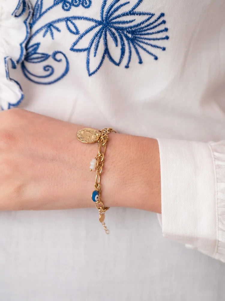 Envie d'ajouter une touche de mystère et de fun à vos looks ? Le bracelet Ellie est là pour ça ! Avec ses maillons dorés chics et ses breloques tendance, il a tout pour plaire. Oeil protecteur bleu, papillon scintillant, perle délicate... Chaque charm raconte une histoire et apporte un esprit bohème à votre poignet.