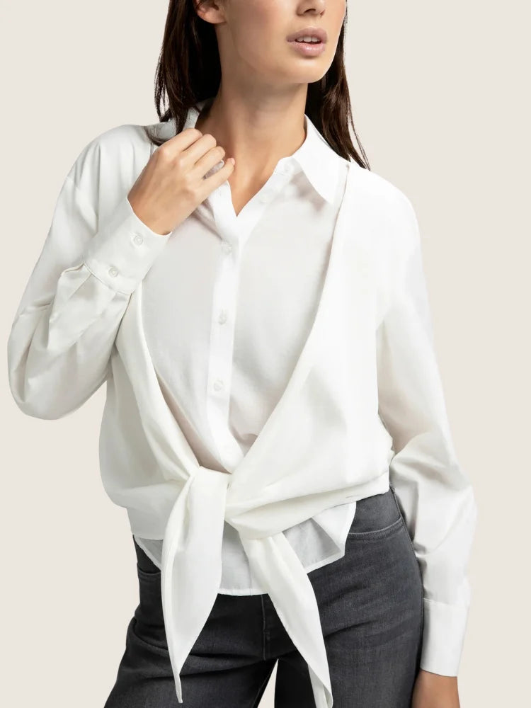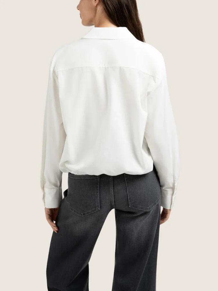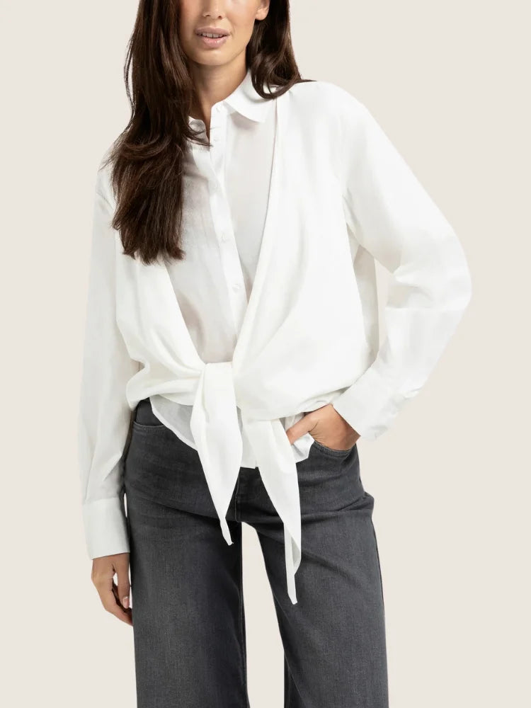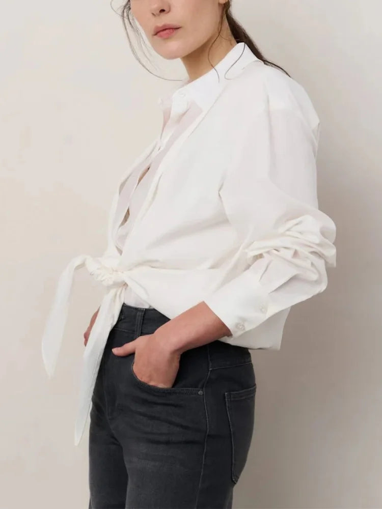 Noora, c'est la chemise blanche qu'on croyait classique jusqu'à ce détail qui change tout. Son effet superposé et son lien à nouer à la taille créent une silhouette féminine, un brin audacieuse, sans jamais en faire trop.
