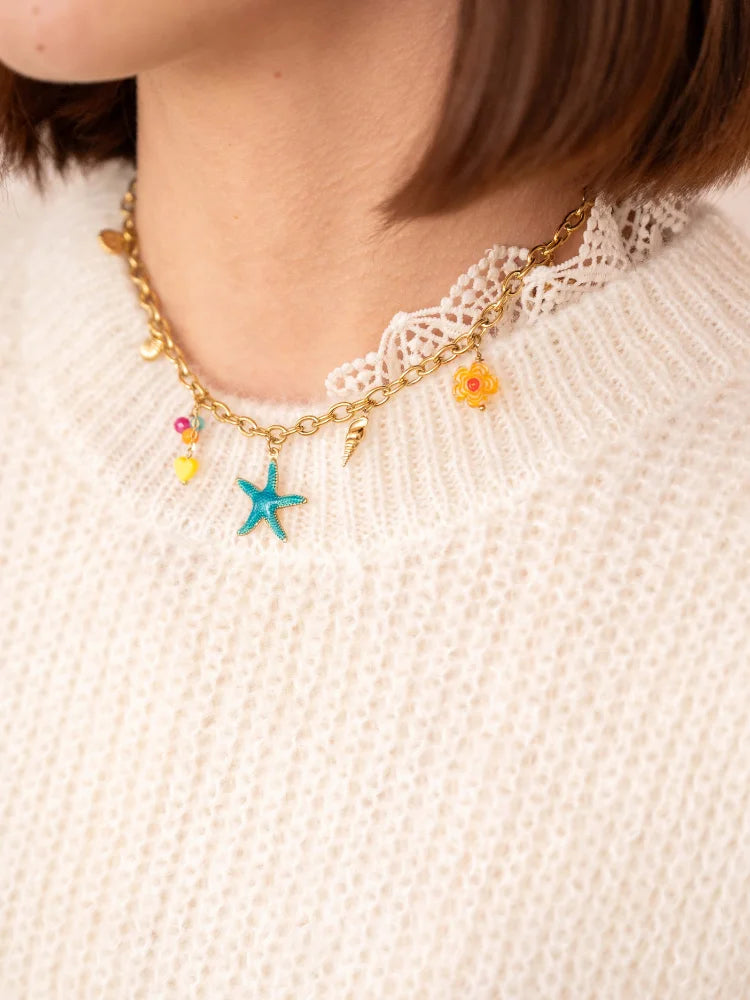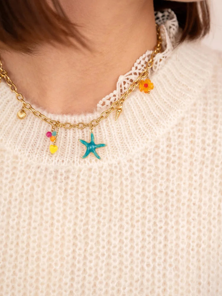 Un vent de liberté souffle sur Amélia, ce collier doré inspiré des plus beaux trésors marins. Entre étoile de mer émaillée, coquillage doré et perles colorées, il évoque ces journées ensoleillées où le sable colle encore à la peau et où les souvenirs d'été s'accrochent au cou.