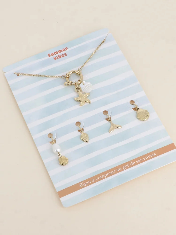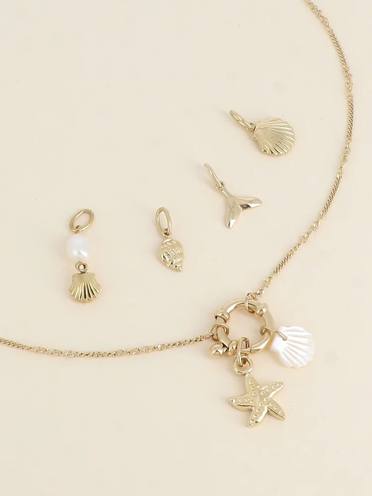 Le collier Elya vous plonge dans un univers iodé et raffiné grâce à sa chaîne dorée délicate et ses pendentifs inspirés de l'océan. Créez votre propre bijou avec ses cinq charms irrésistibles : une étoile de mer scintillante, une queue de sirène, une perle nacrée accompagnée d'un coquillage et une coquille dorée...