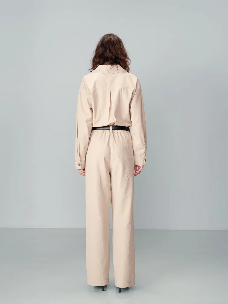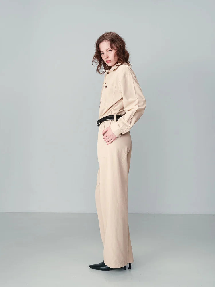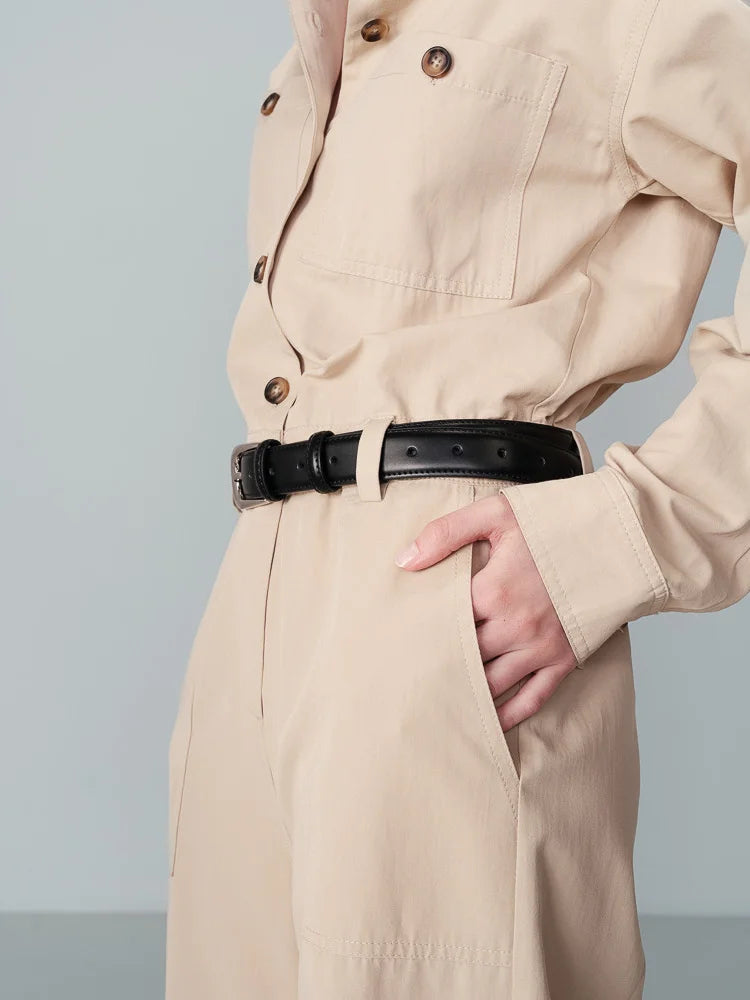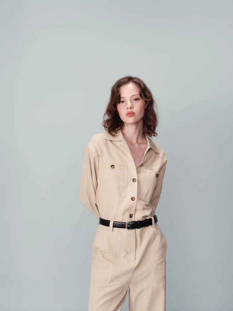 Dans sa teinte sable naturelle, la combinaison Nord de chez Grace & Mila allie style et confort pour des journées pleines de caractère. Avec son col chemise, ses poches plaquées et sa ceinture amovible, elle apporte ce petit air d'aventure qui rend chaque sortie unique.