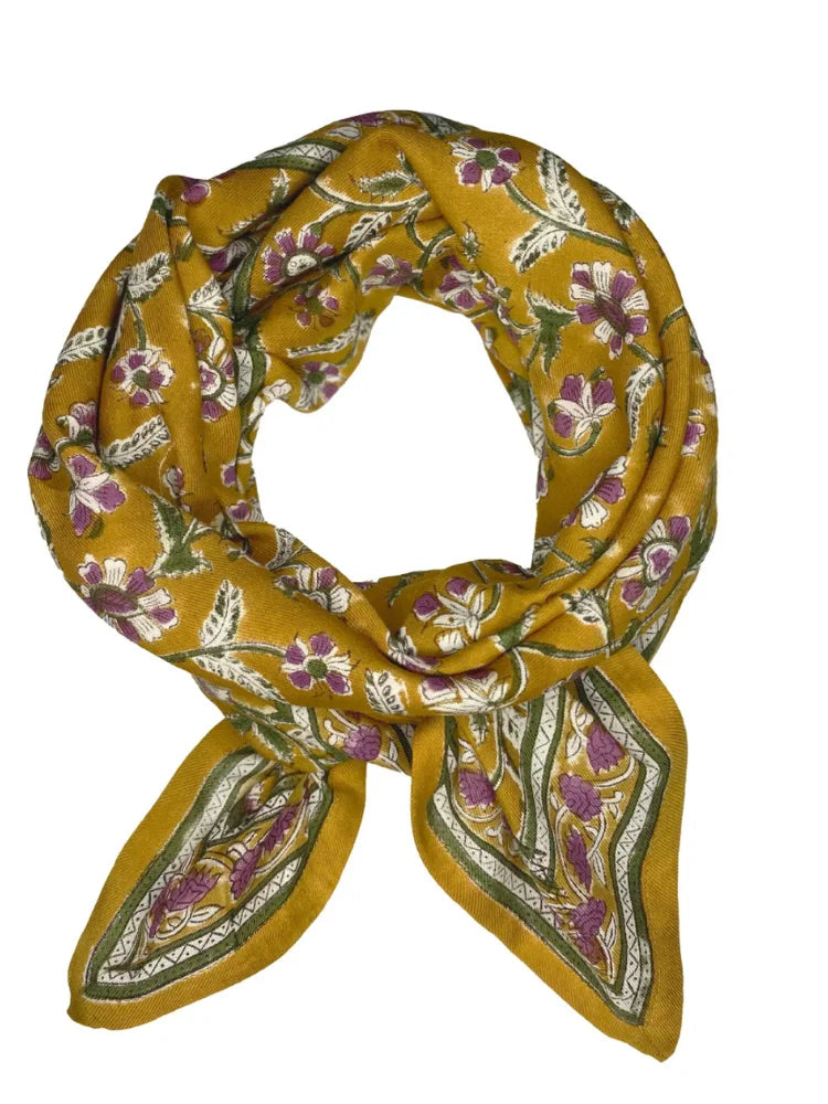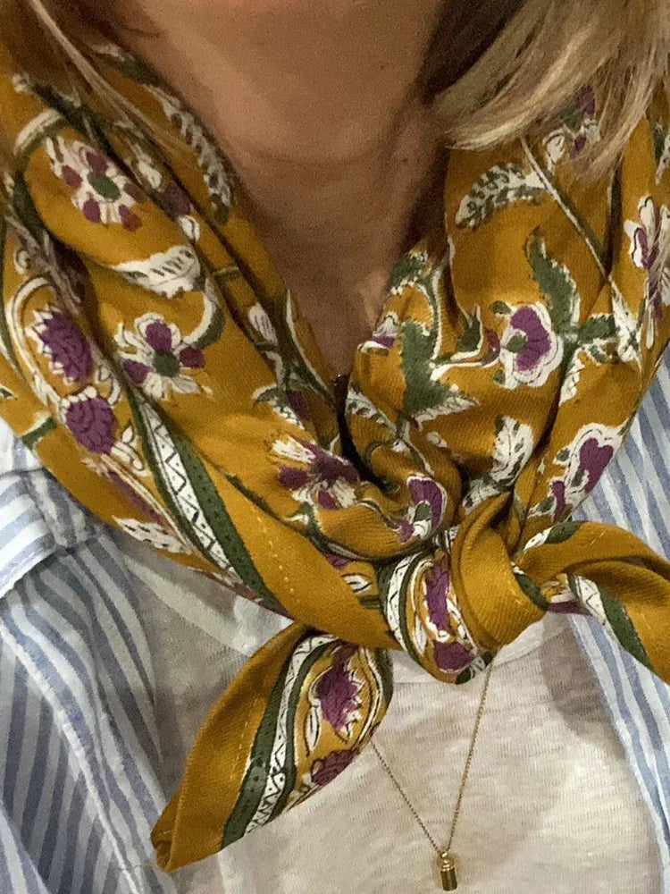 Ajoutez une touche d'exotisme à votre look avec le foulard Delhi Cumin de chez So Family. Ce grand carré de 100x100 cm, avec ses motifs floraux délicats et ses nuances épicées de cumin, est l'accessoire parfait en toute saison.