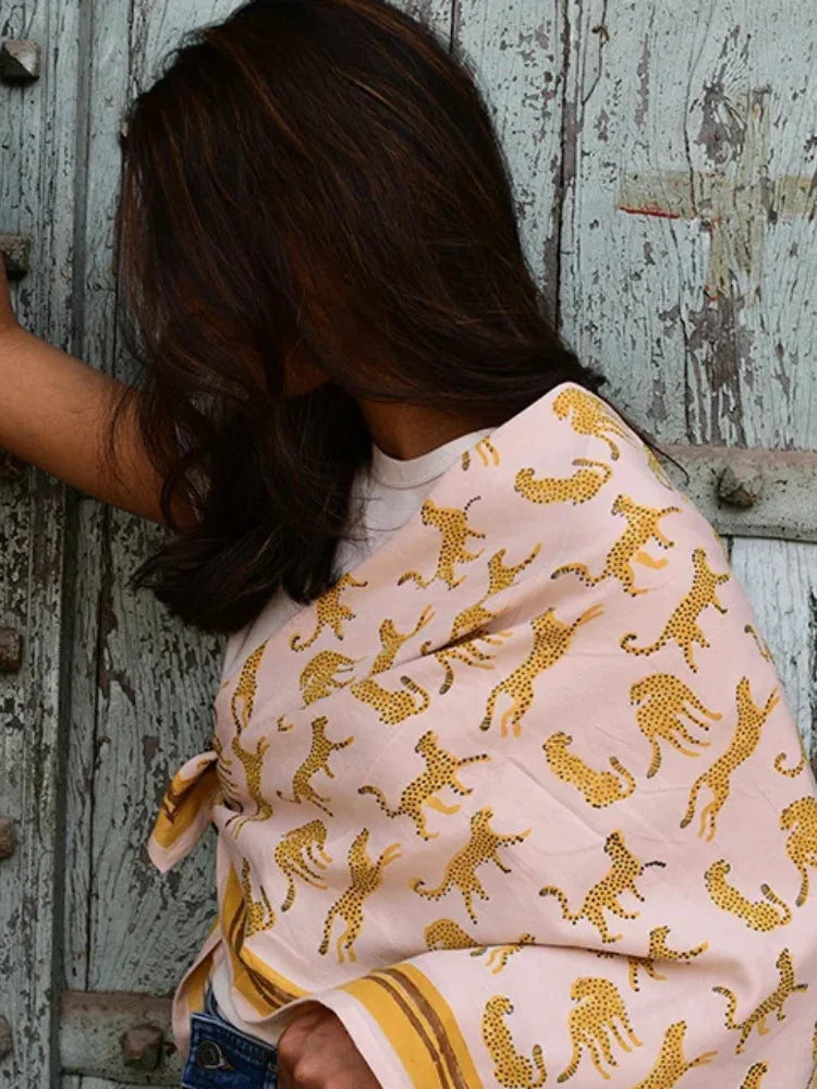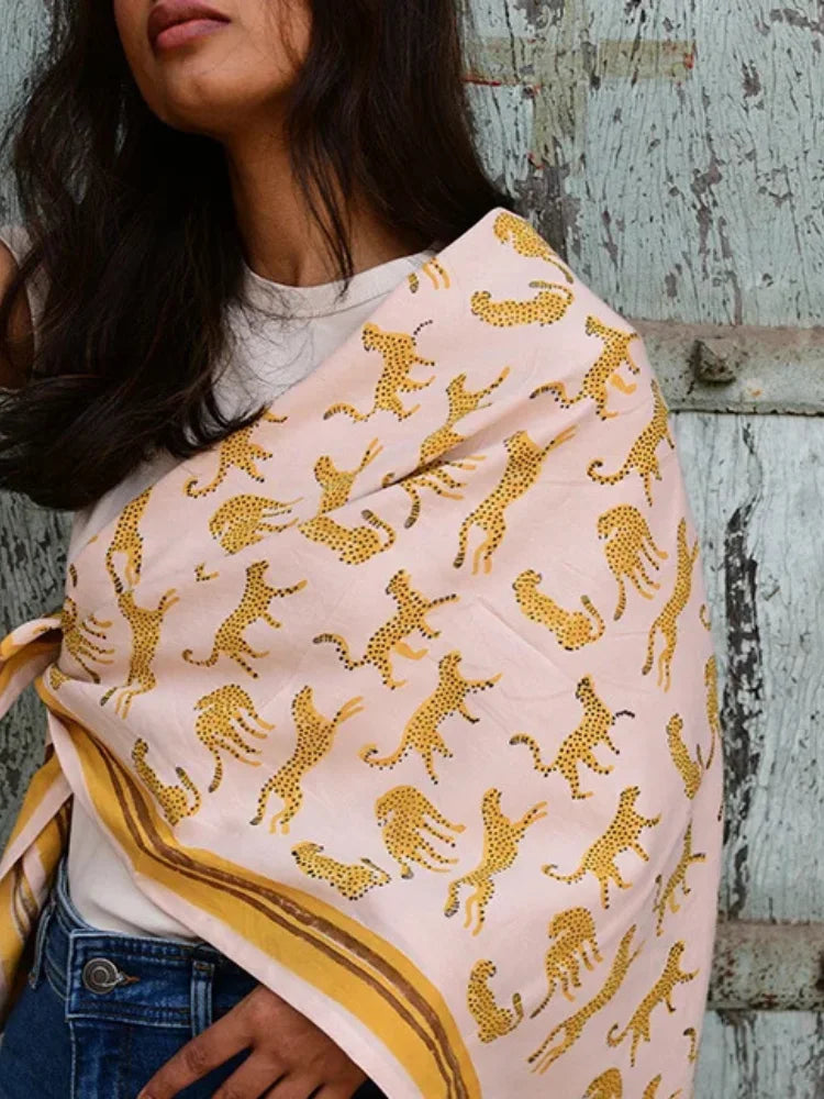 Le grand foulard Fauve rose est bien plus qu'un simple accessoire : avec sa douce teinte rose pastel et ses léopards majestueux, il s'impose comme la touche parfaite pour transformer n'importe quelle tenue.