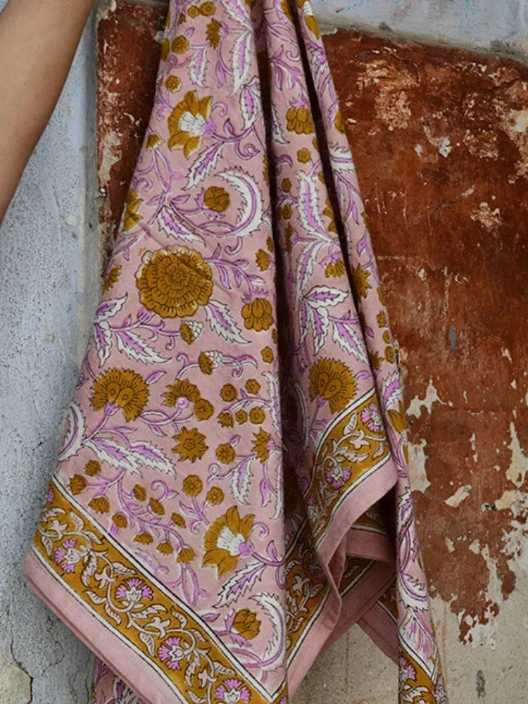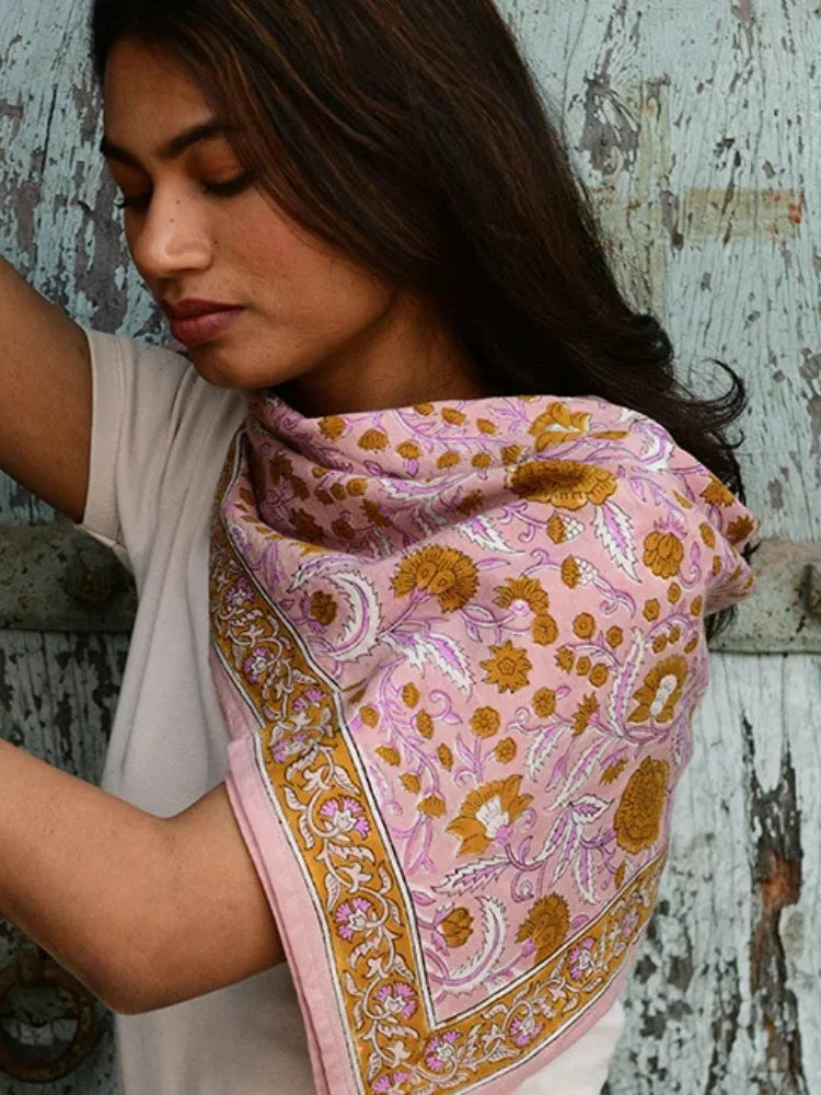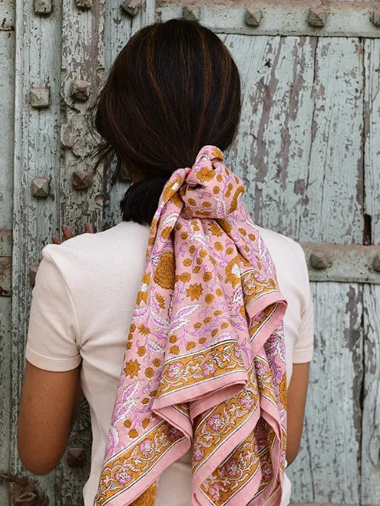 Le grand foulard n°112 rose est un véritable rayon de soleil à ajouter à votre dressing. Avec son fond rose poudré, délicatement rehaussé de fleurs curry et de feuilles rose pastel, il insuffle douceur et lumière à tous vos looks.