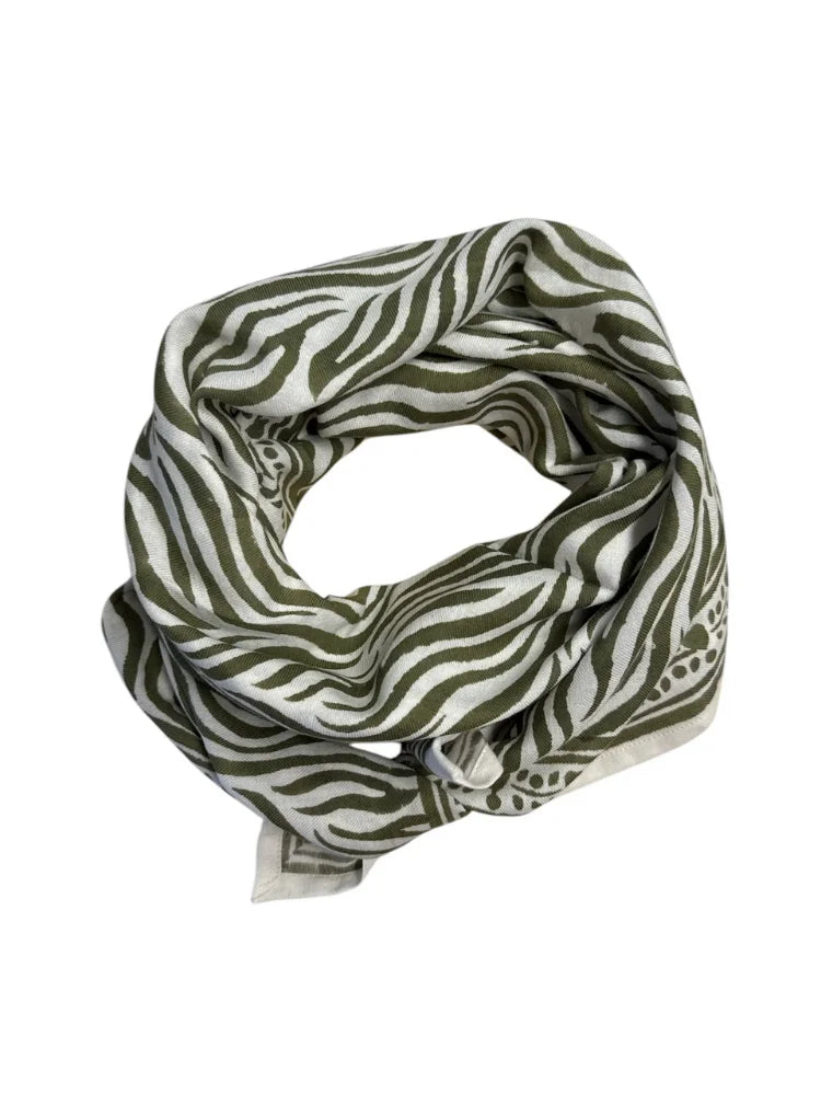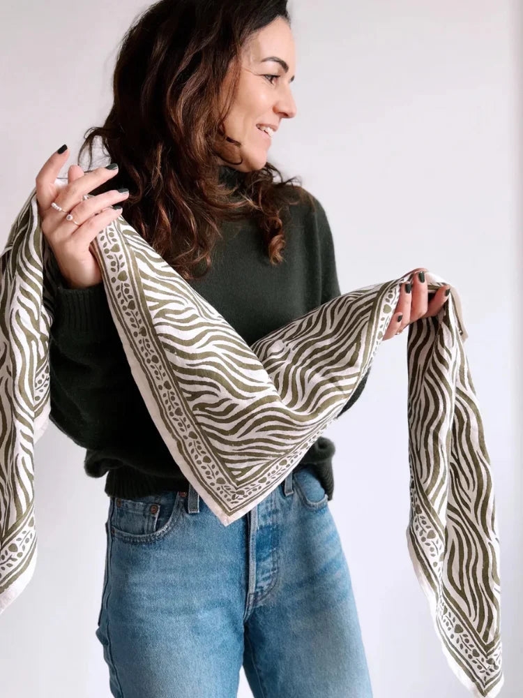 Laissez votre style rugir avec élégance grâce au grand foulard Zèbre de Maison Augustin. Avec ses dimensions généreuses de 100x100 cm, ce foulard revisite l'imprimé zèbre dans des teintes douces et intemporelles. Parfait pour se draper avec chic en toute occasion...