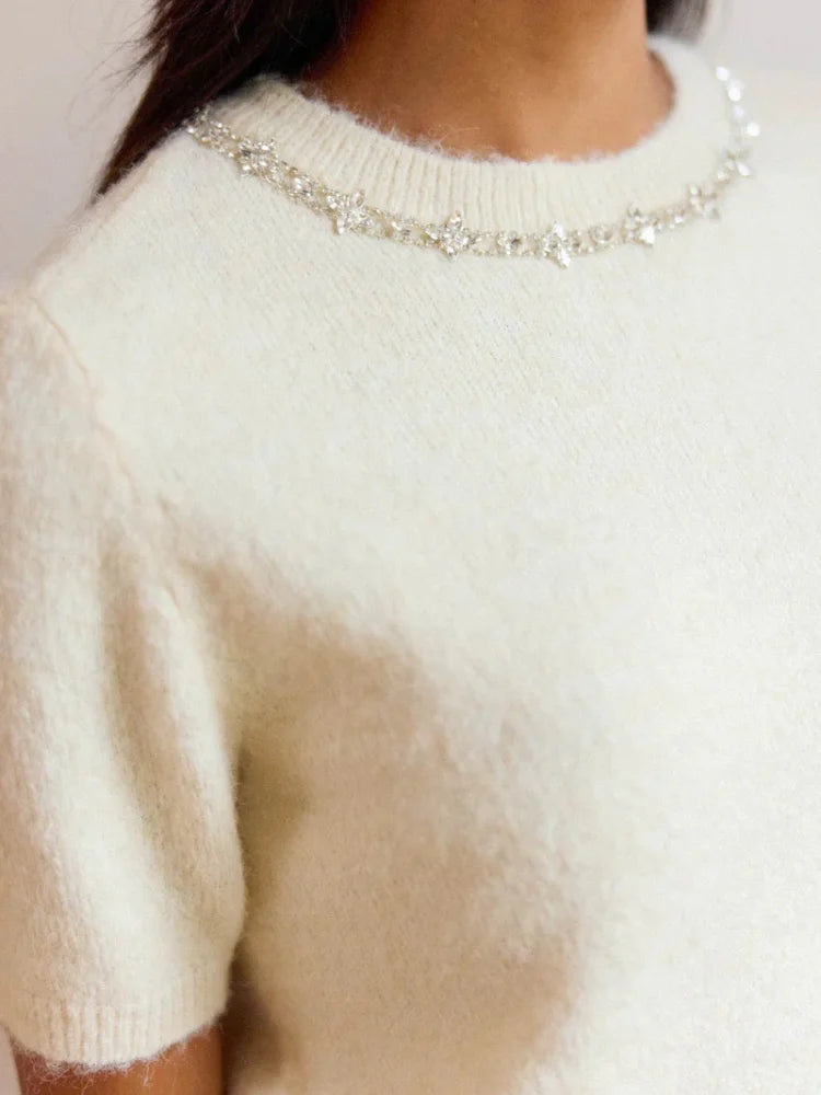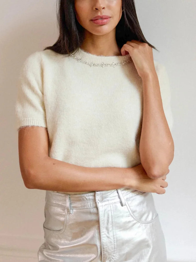 Avec sa maille moelleuse, ses manches courtes et son col rond bijouté, il évoque les soirées où l'on veut briller sans trop en faire, les cafés en terrasse en plein mois de janvier, les fêtes improvisées au coin du feu. On le porte comme une confidence : douce, précieuse, un peu magique.