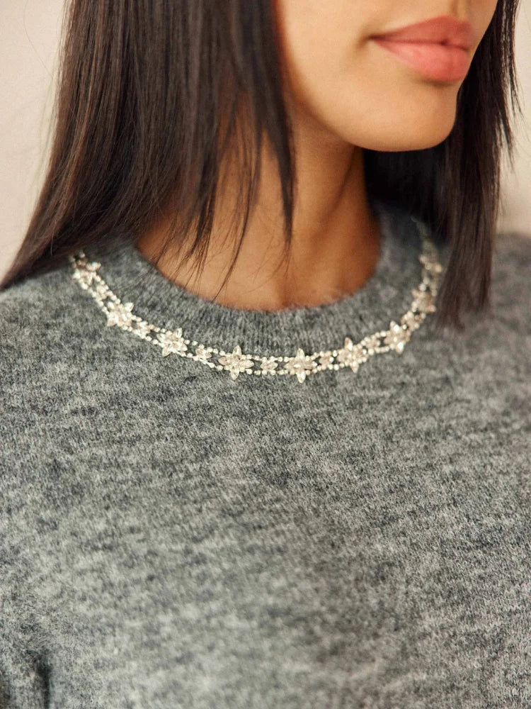 Il y a des pièces qui transforment l'allure en un battement de coeur. Le pull Matis de chez La Petite Étoile, avec son col paré de strass, en fait partie. Dans sa version écrue ou gris chiné, il réchauffe l'hiver d'une lumière douce, presque céleste. Sur une jupe satinée, un jean ou un pantalon en cuir, il apporte ce soupçon d'éclat qui change tout.