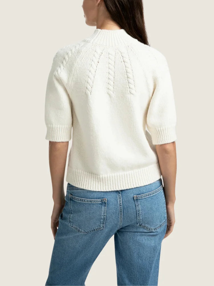 Une allure douce et affirmée à la fois : Stella, c'est le pull qu'on enfile le matin sans réfléchir, et qui fait tout le travail. Sa maille épaisse réchauffe le style avec simplicité, son col montant dessine le port de tête, et ses demi-manches dévoilent juste ce qu'il faut.