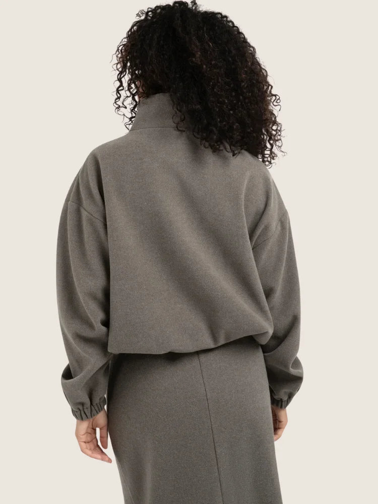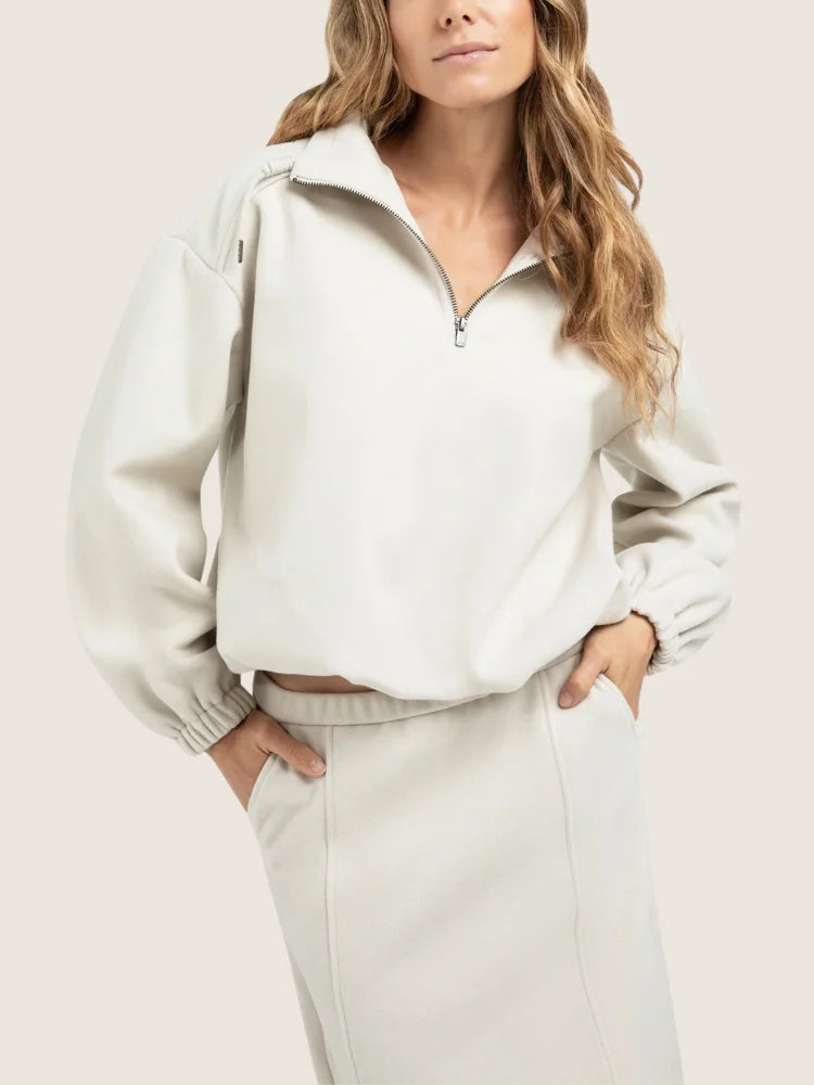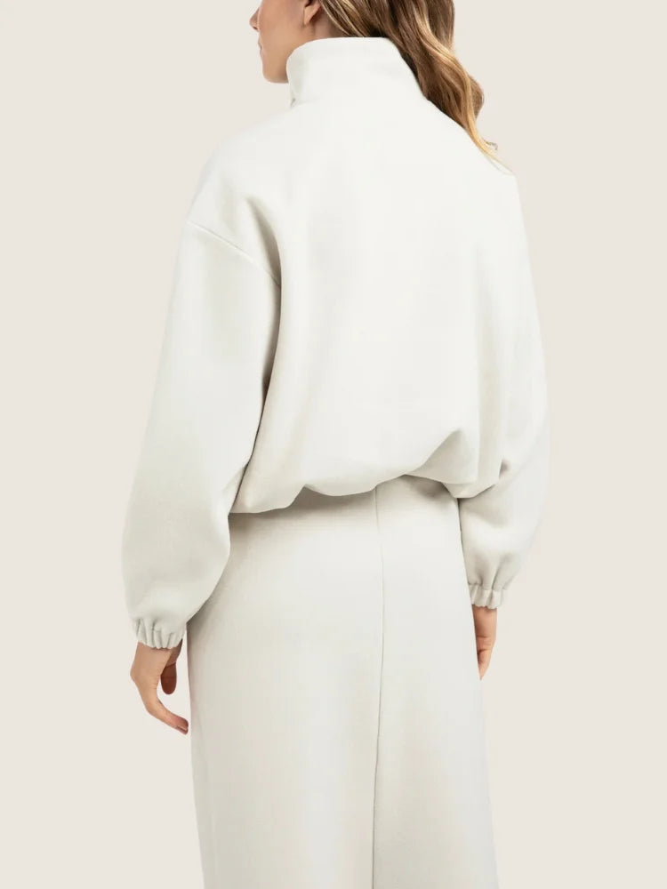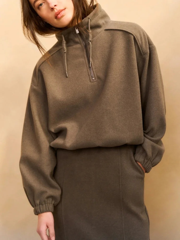 Le sweat Love, c'est un peu la version cocooning du chic moderne. Avec ses manches ballon légèrement bouffantes et son col haut zippé à cordon discret, il allie confort et allure sans effort. On aime sa coupe souple, ses finitions élastiquées et ce tombé un brin structuré qui flatte toutes les silhouettes.