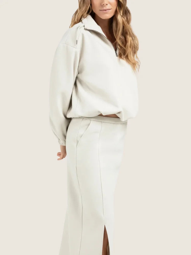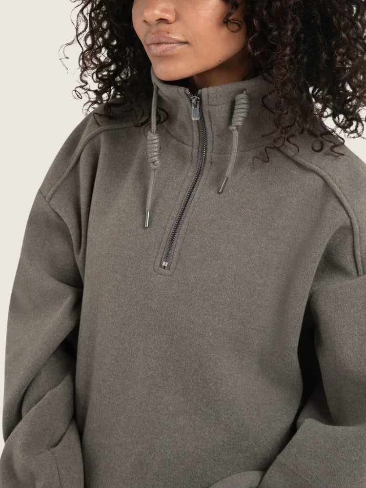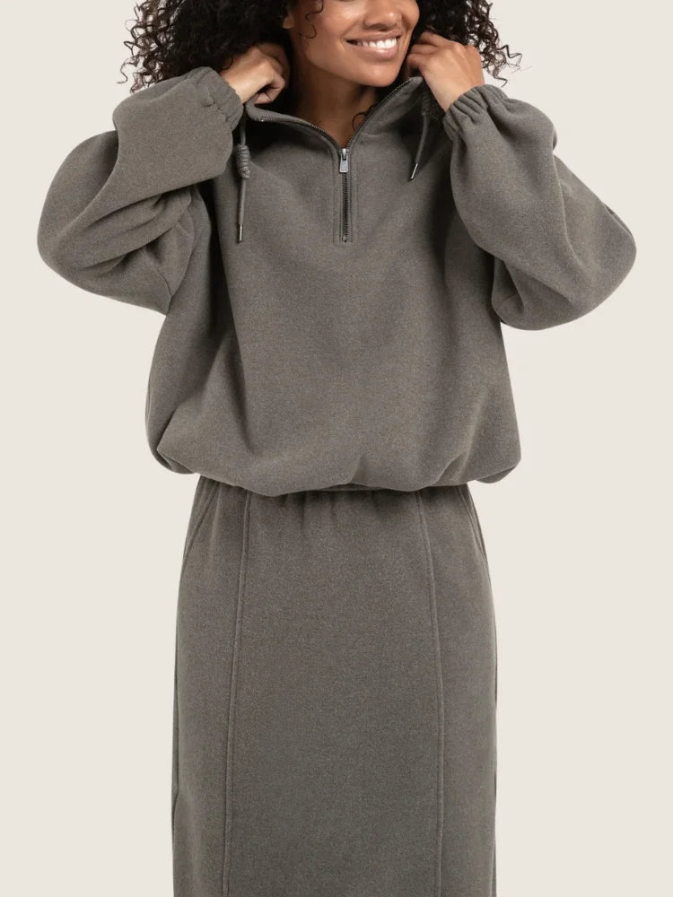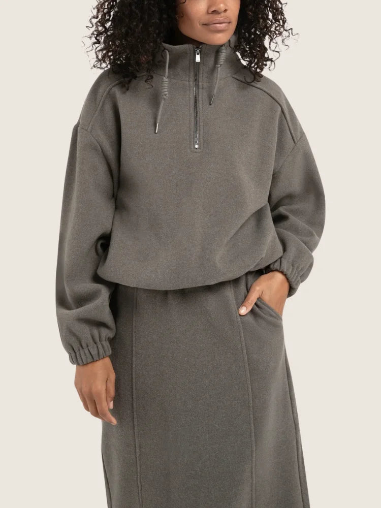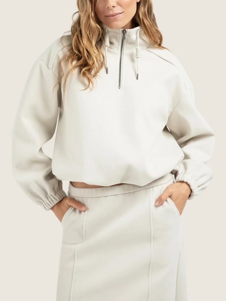 Le sweat Love, c'est un peu la version cocooning du chic moderne. Avec ses manches ballon légèrement bouffantes et son col haut zippé à cordon discret, il allie confort et allure sans effort. On aime sa coupe souple, ses finitions élastiquées et ce tombé un brin structuré qui flatte toutes les silhouettes.