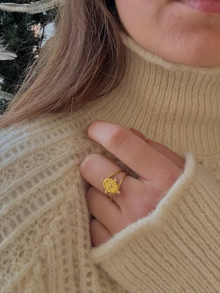 Dorée et lumineuse, elle réchauffe la silhouette et apporte une touche précieuse sans ostentation. Portée seule, elle affirme son caractère, associée à d'autres bagues, elle crée un jeu de contrastes subtil. Une bague forte et sensible à la fois, parfaitement dans l'air de l'automne-hiver 2025.