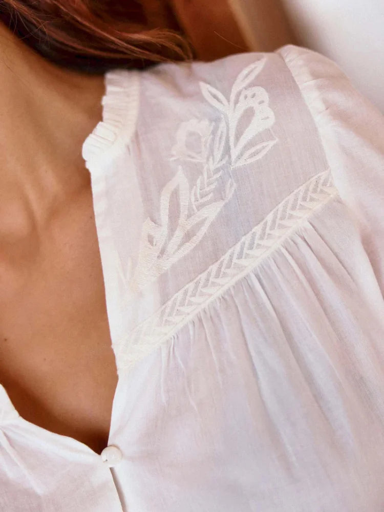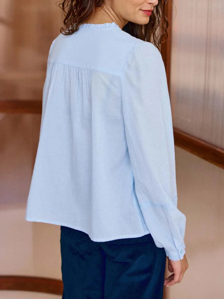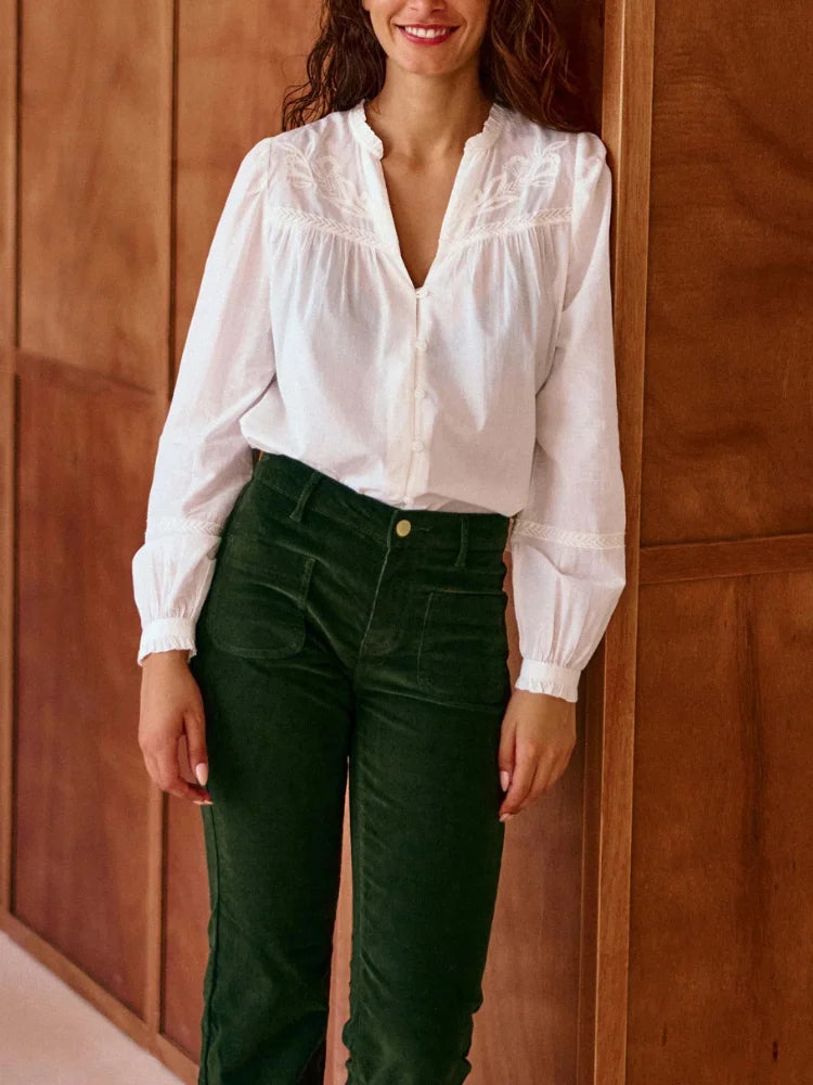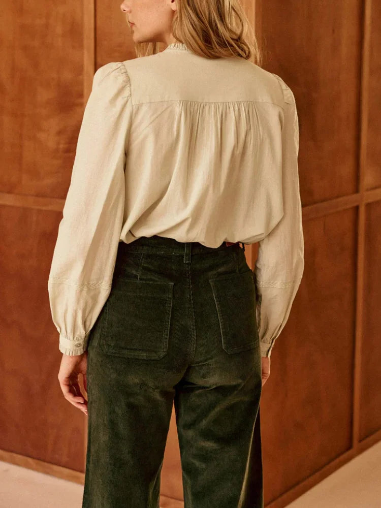 On aime son encolure volantée qui flatte le décolleté sans en faire trop, ses manches légèrement bouffantes qui donnent du caractère, et ses quatre déclinaisons qui s'adaptent à toutes vos envies. Une blouse qu'on garde près de soi, parce qu'elle sauve aussi bien les matins pressés que les soirées improvisées.