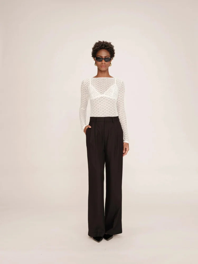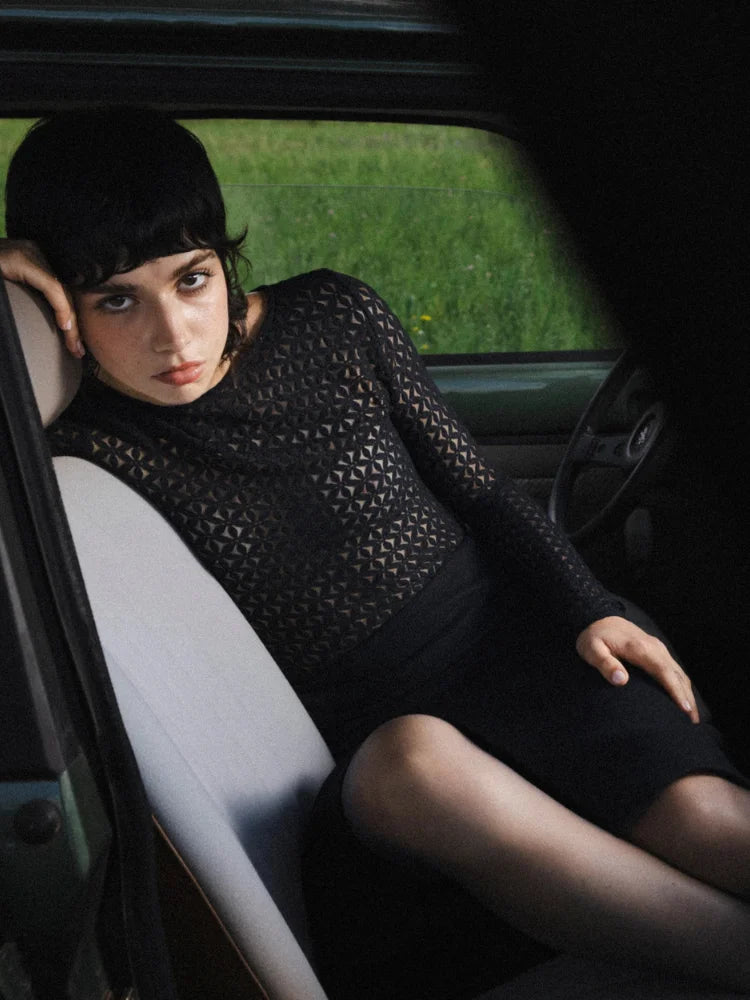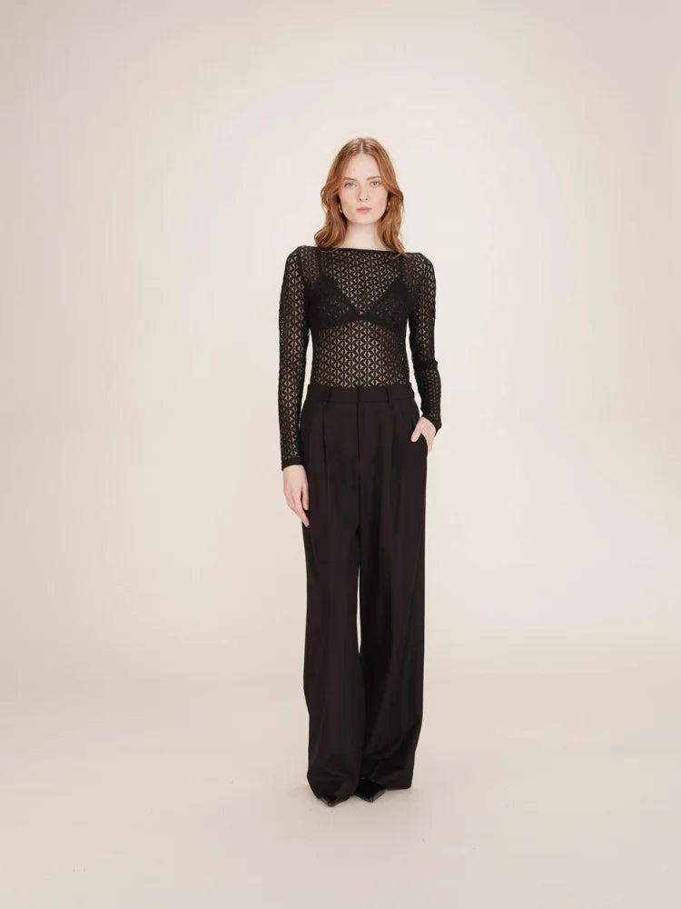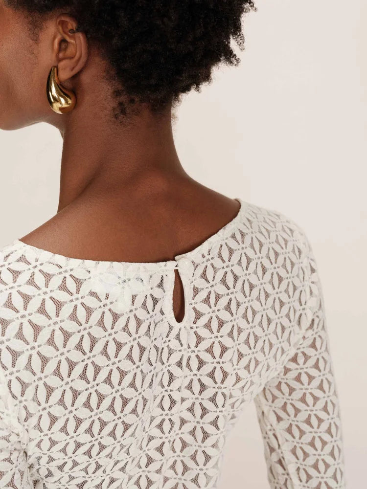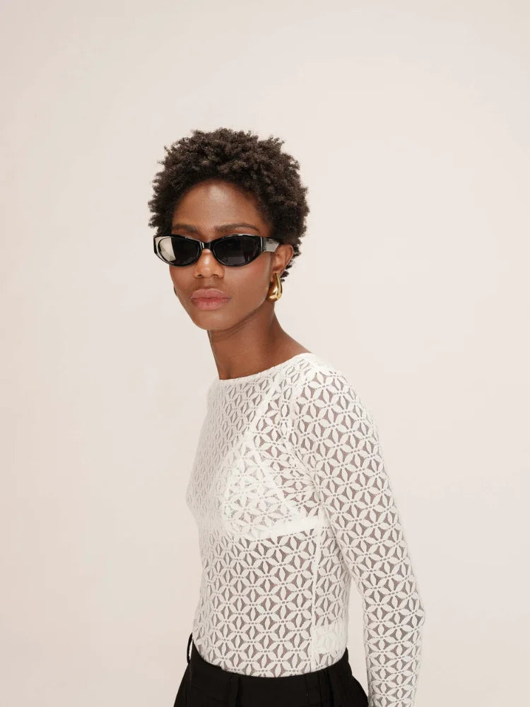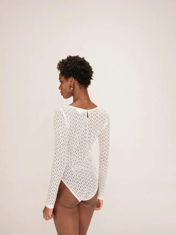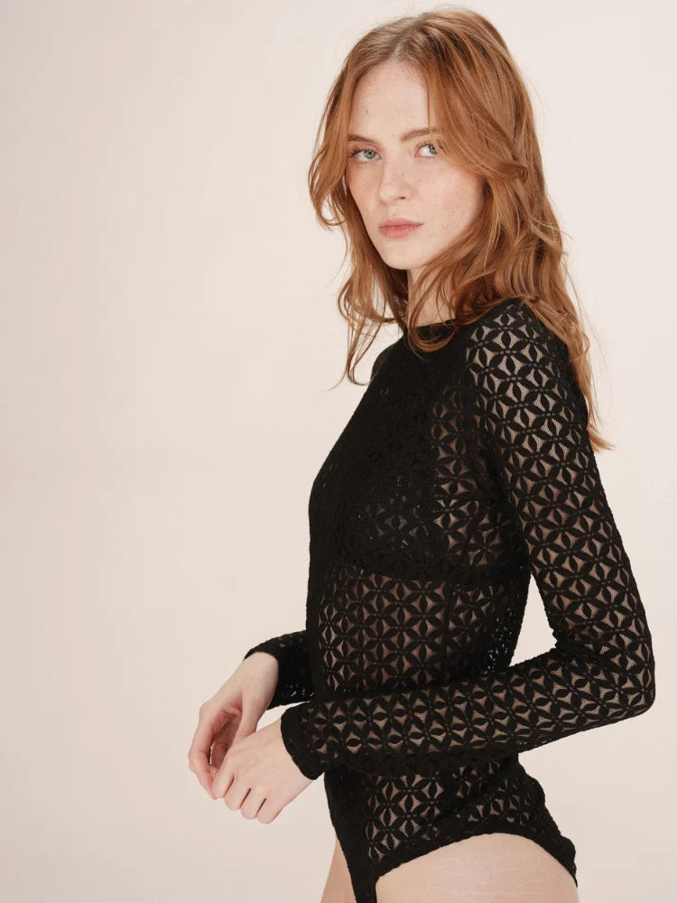 Tanguy, c'est le body Grace & Mila qui fait rimer élégance et audace. Tout en transparence, il dessine une silhouette délicate grâce à sa dentelle géométrique et sa coupe ajustée. Son encolure bateau dévoile subtilement les épaules, pendant que les manches longues équilibrent le tout avec une touche chic et minimaliste.
