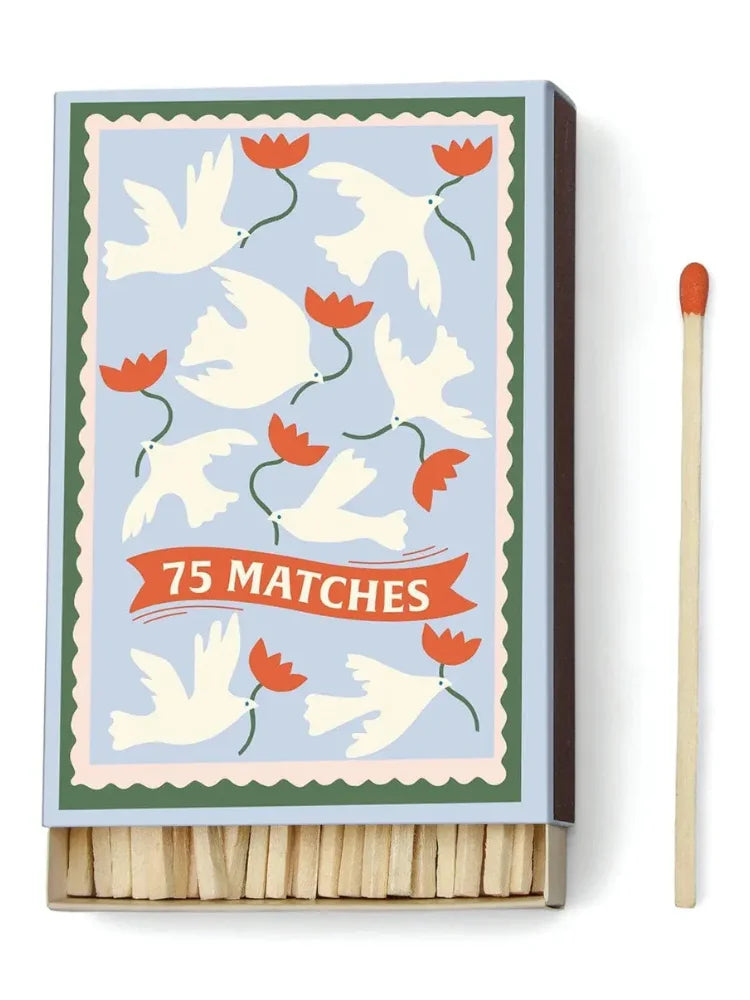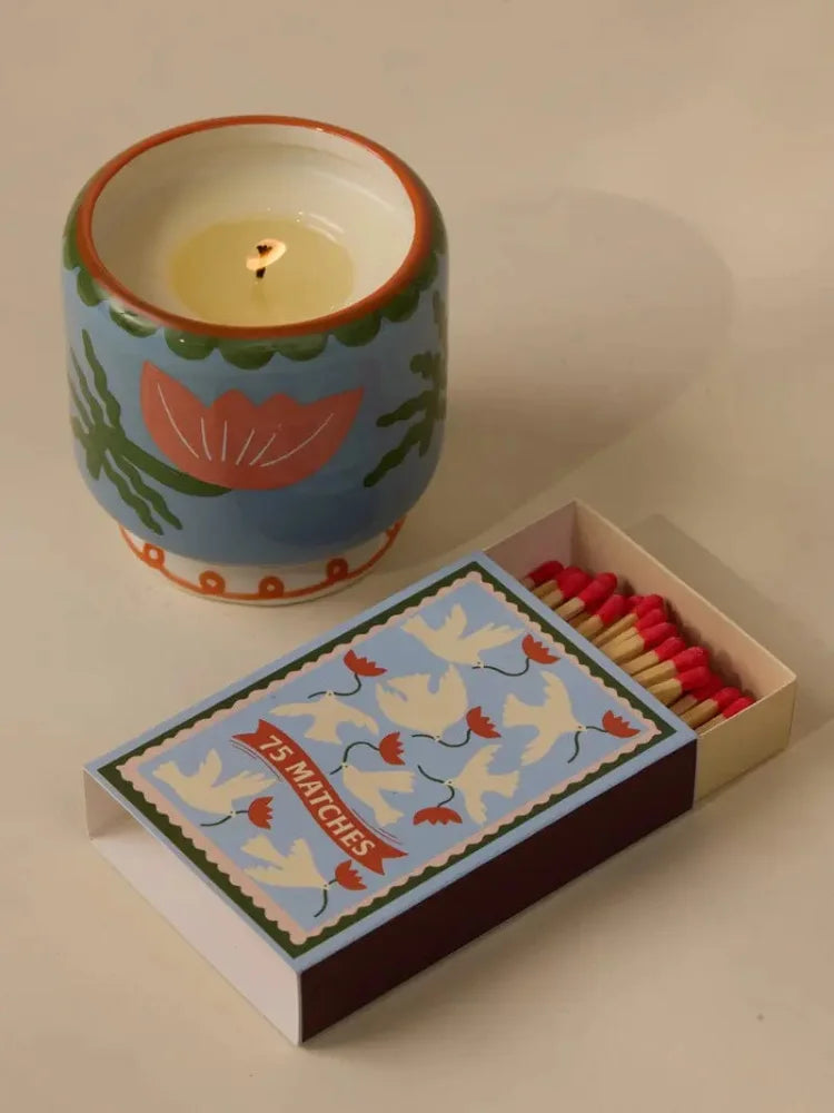 Apportez une touche de poésie et de couleur à vos instants cocooning avec la boîte d'allumettes Flower Orange. Son design rétro orné de colombes et de fleurs rouges transforme un objet du quotidien en véritable accessoire déco.