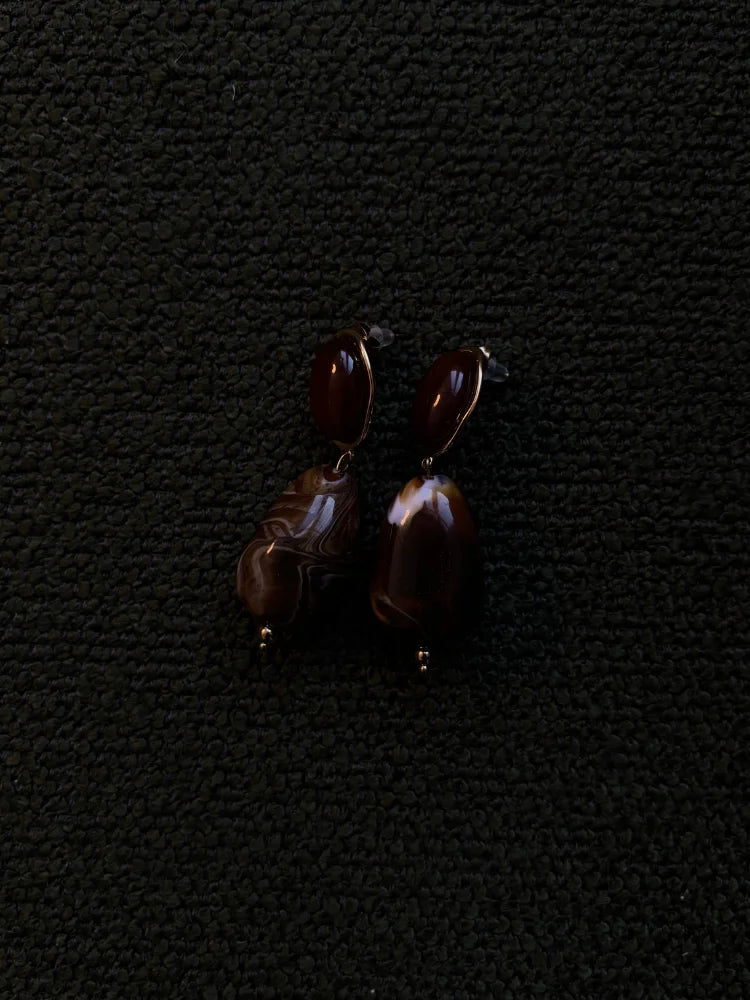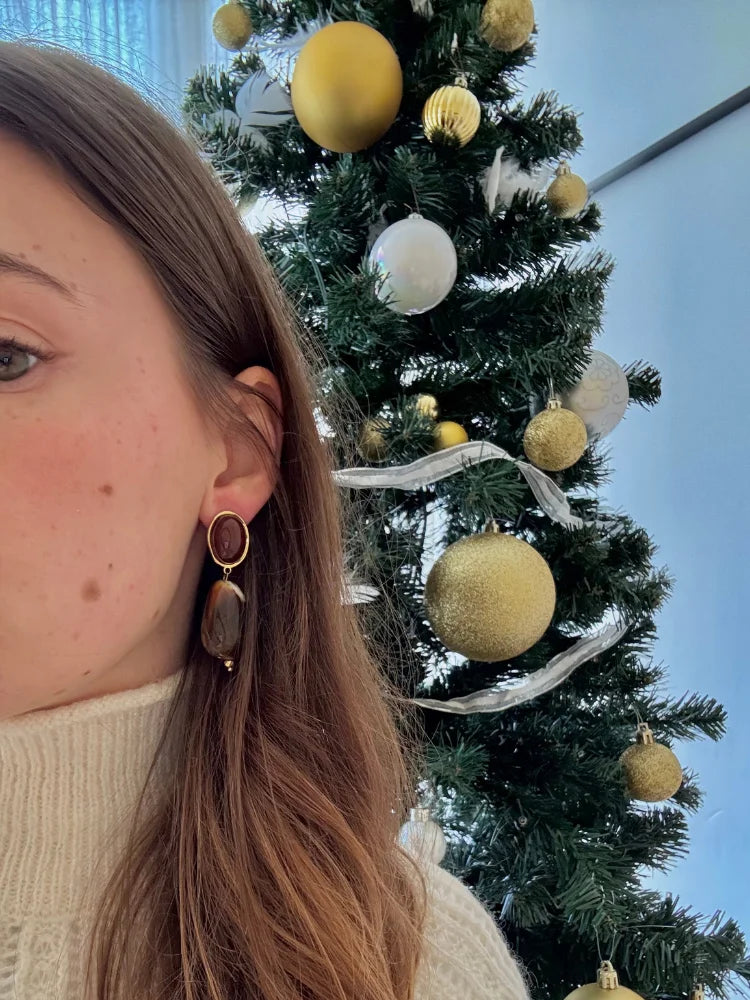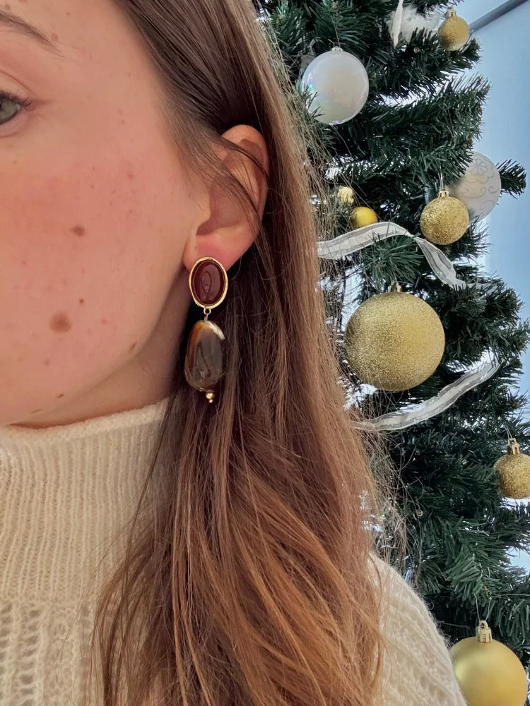 Les boucles d'oreilles Confidence affirment une présence douce mais assumée. Leur design mêle volumes généreux et lignes élégantes, dans un jeu de teintes profondes et chaleureuses. Le doré vient souligner la matière, tandis que les formes organiques apportent une touche presque minérale, très tendance pour l'automne-hiver 2025.