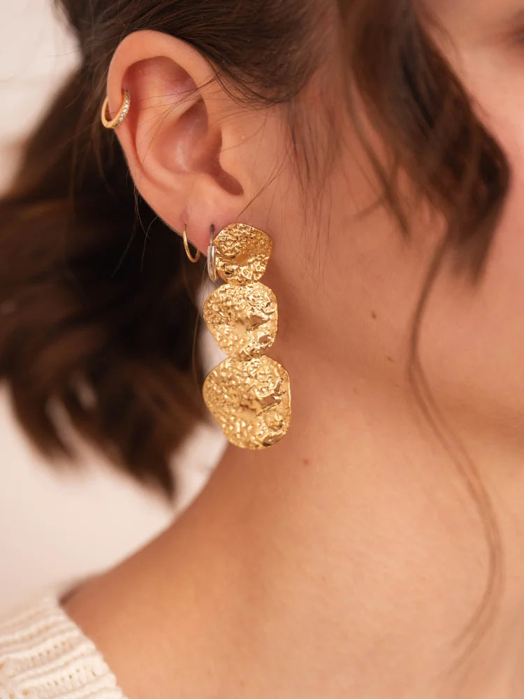 Trois pastilles dorées, toutes différentes, toutes vibrantes, comme un bijou trouvé au fond d'une malle ancienne. Yasmine, c'est ce petit twist qui donne du relief à un look sage, ou qui sublime un chignon flou sans en faire trop.