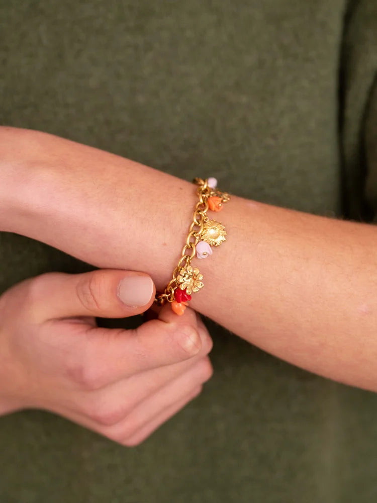 Un bijou comme un bouquet d'émotions. Valentina, c'est ce bracelet doré qui fait vibrer le coeur et illumine le poignet d'une touche solaire. Ses breloques en forme de fleurs colorées dansent au gré des mouvements, apportant cette note de poésie qui change tout.