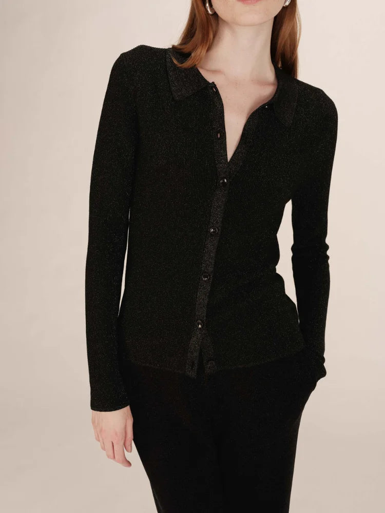On adore son petit col chemise (un brin rétro, très tendance cet hiver) et sa coupe ajustée qui met en valeur sans serrer. Le genre de maille qu'on porte au bureau, en soirée ou pour un café en ville, toujours avec ce petit éclat discret qui fait la différence.