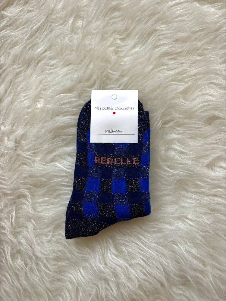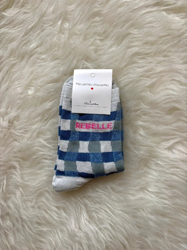 Parce qu'il y a du feu dans les coeurs libres, Mila & Stories signe une paire de chaussettes qui claque comme un slogan. "Rebelle" brodé en lettres contrastées, des carreaux façon damier revisités en couleurs pop ou profondes, et des fils lurex qui brillent juste ce qu'il faut...