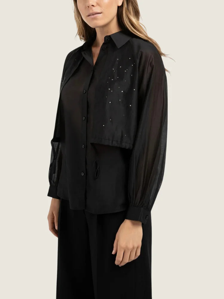 Entre sophistication discrète et allure contemporaine, la chemise Marceau en noir est une ode à la légèreté. Son tissu fluide et légèrement transparent laisse deviner juste ce qu'il faut, tandis que les broderies délicates à l'avant apportent une touche précieuse et brillante.