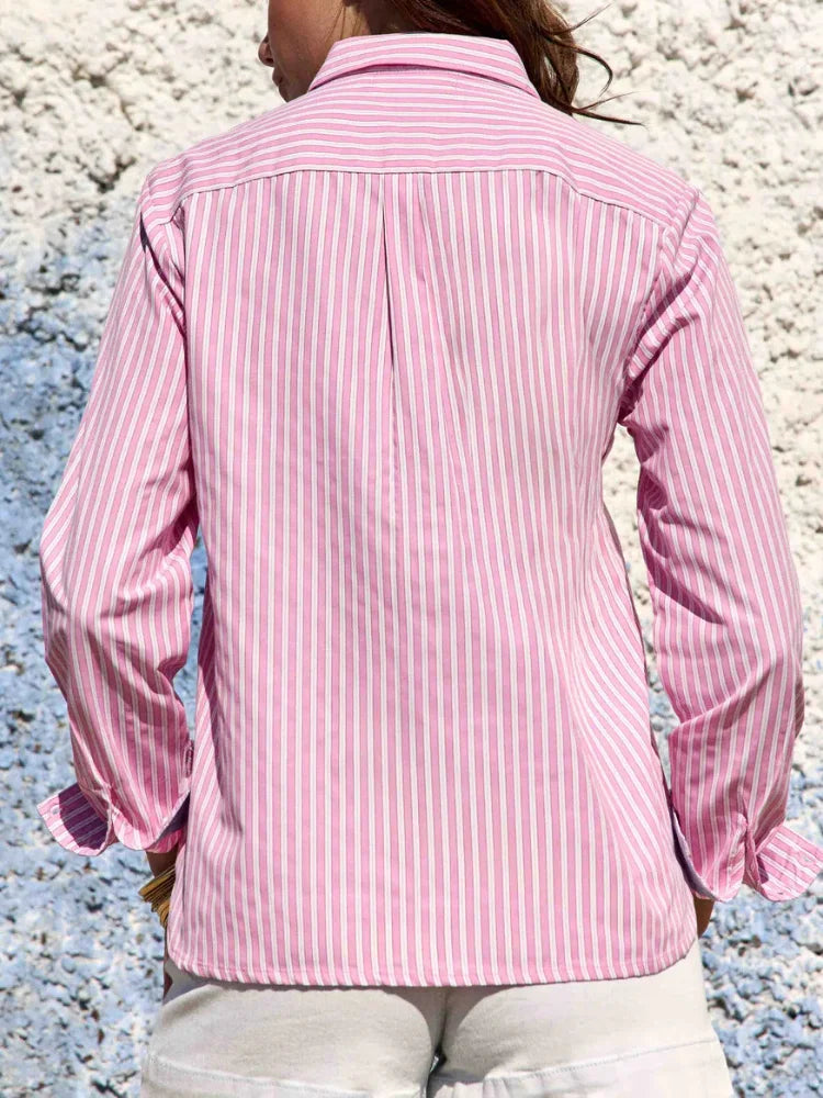 La chemise rayée, on pensait tout savoir d'elle. Et puis arrive la Carla de La Petite Étoile, et elle remet tout à plat, dans le bon sens du terme. Ses rayures roses et écru sont lumineuses, presque solaires, mais c'est dans les détails que la magie opère vraiment : des poignets et un col intérieur en tissu contrasté bleu pâle qui apparaissent quand on retrousse les manches, des boutons nacrés ton sur ton qui captent la lumière, et une pince dos discrète qui structure la tenue sans la brider. C'est précisément ce genre de soin artisanal qui transforme une chemise en pièce signature.