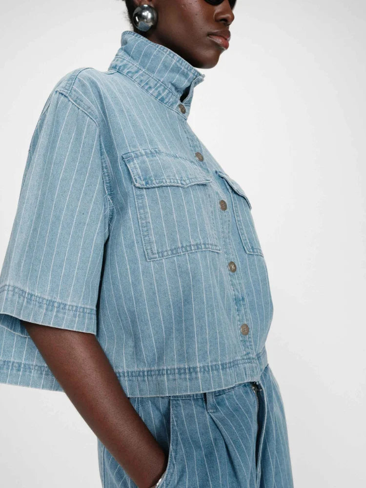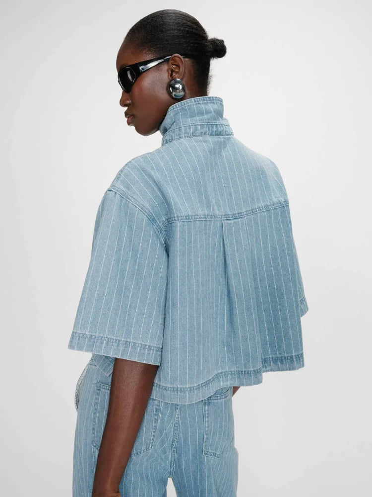 Son denim rayé bleu apporte du relief sans en faire trop, pendant que la coupe courte et oversize dessine une allure contemporaine, presque architecturale. On la porte en total look denim, ou simplement glissée sur un pantalon tailleur pour casser les lignes trop sages.