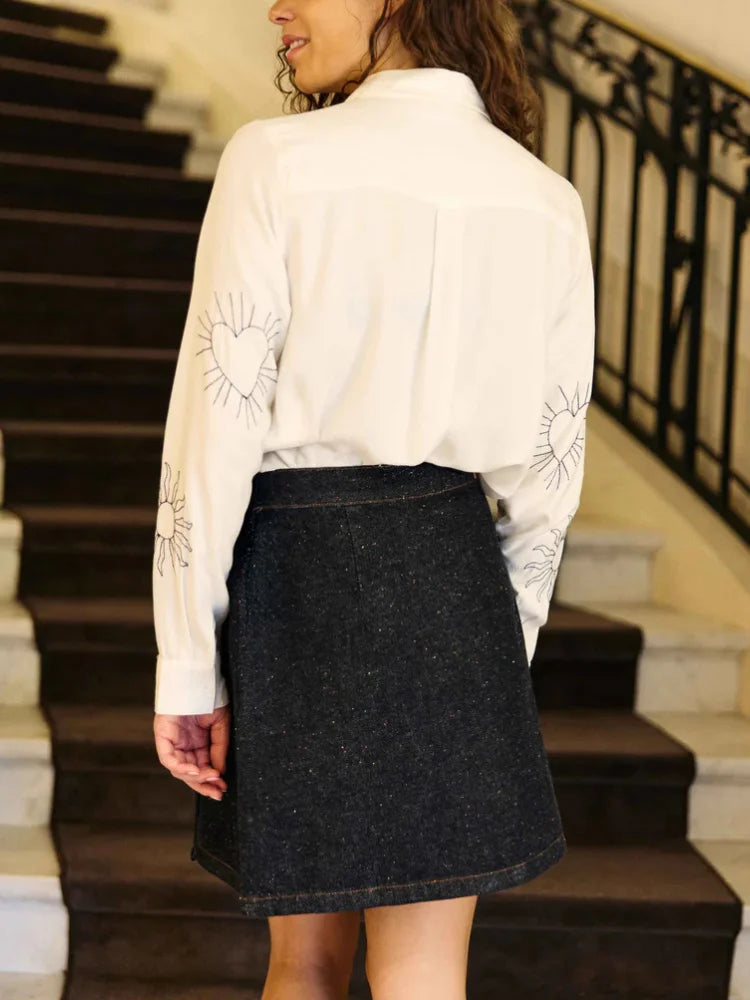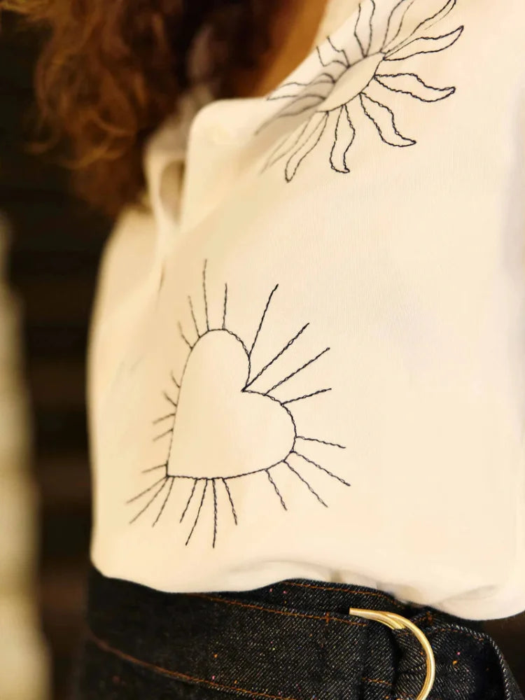 Le chemisier Chania de La Petite Étoile dessine une silhouette douce et lumineuse. Sur l'écru délicat, les broderies constellations racontent une histoire de ciel clair, de signes discrets et de poésie à porter. Une pièce qui capte les tendances : sensible, graphique, facile à vivre.