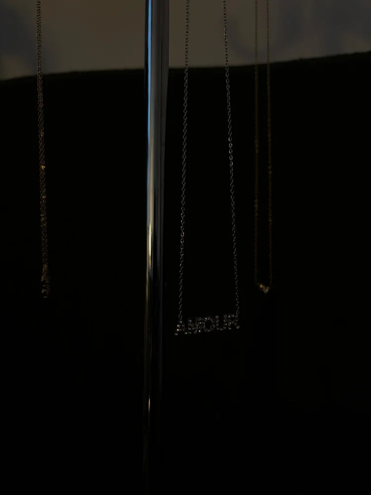 Le collier Intime se porte comme un murmure. Fin, délicat, presque secret, il dévoile un mot chargé de sens, serti de lumière, posé juste là où il faut. Son design épuré laisse toute la place à l'émotion : un bijou qui parle doucement, mais qui dit beaucoup. Parfait pour celles qui aiment les détails discrets et les pièces qui résonnent.