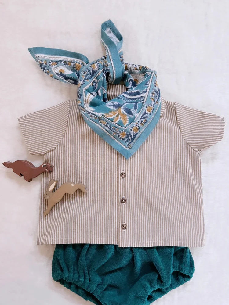 Pensé pour accompagner le quotidien, des plus petits aux plus grands, il se porte librement, sans règles. On aime son imprimé, inspiré des motifs artisanaux, et sa matière en coton qui reste agréable saison après saison. Un foulard qui vit, qui bouge, qui se transmet presque.