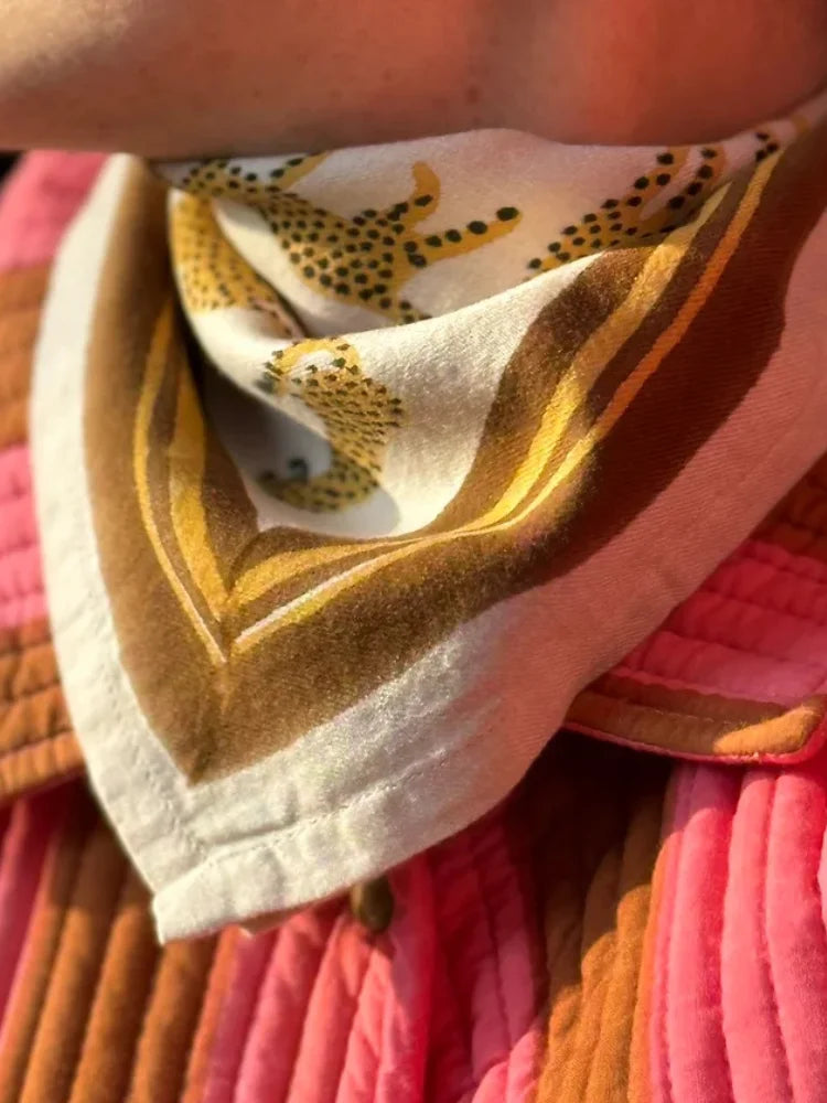 Laissez entrer un brin de fantaisie dans votre dressing avec le foulard Fauve Rose de chez Byzantine. Orné de léopards espiègles sur un fond rose pastel délicat, il est le parfait équilibre entre élégance et audace.