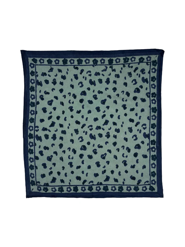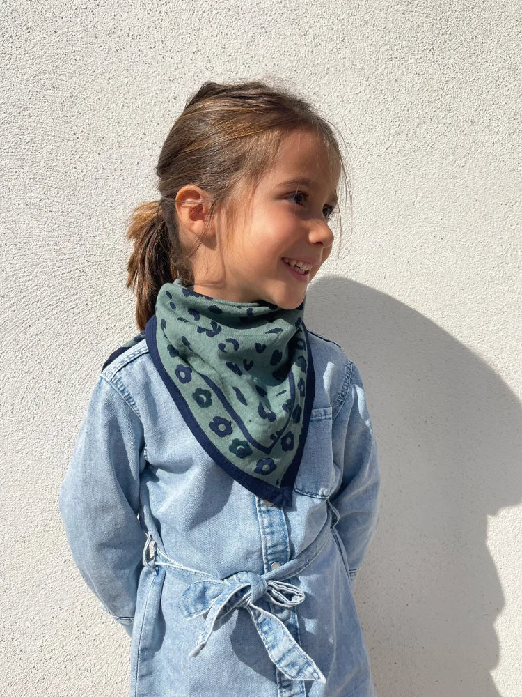 Petit mais audacieux, le foulard Oscar Graou Céladon de Milinane est la touche féline qui booste n'importe quelle tenue. Son imprimé léopard bleu nuit sur fond vert céladon, appliqué selon la technique traditionnelle du block print, en fait une pièce artisanale unique, douce et légère.