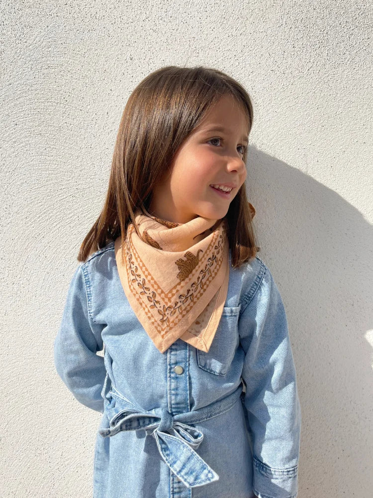 Le petit foulard Oscar imprimé tigre pêche de Milinane est l'accessoire idéal pour insuffler une dose d'originalité et de douceur à n'importe quelle tenue. Avec son format compact, il s'adapte à tous les styles : noué autour du cou, du poignet, dans les cheveux ou même accroché à un sac, il accompagne petits et grands au quotidien.