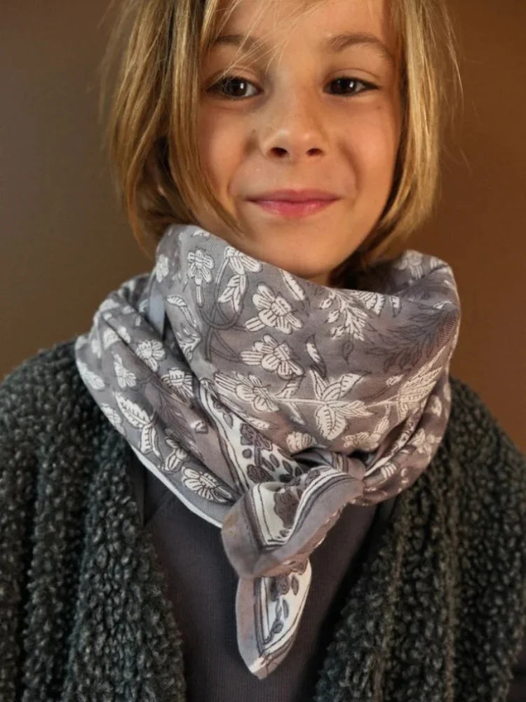 Le grand foulard Calcutta Grey enveloppe de chaleur et de poésie grâce à son coton léger et sa teinte gris nuage parsemée de fleurs fines. Ample et délicat, il se porte aussi bien noué autour du cou qu'en châle sur les épaules, ou encore en version bohème dans les cheveux.