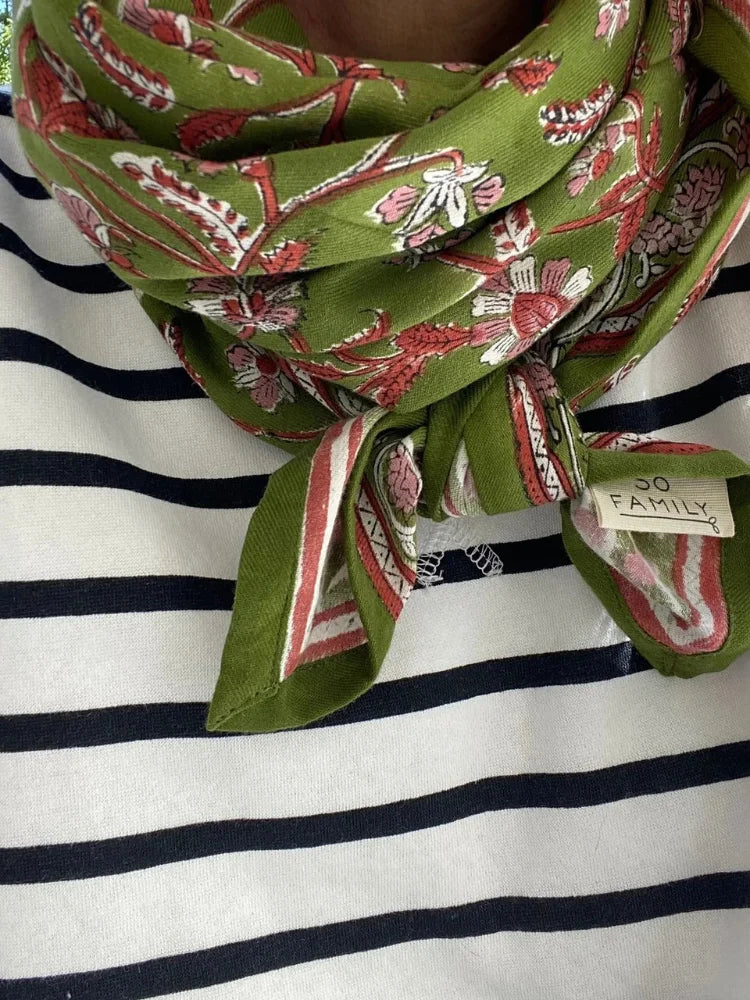 Le grand foulard Delhi Menthe de chez So Family en 100x100 cm, aux nuances douces de menthe, est l'allié parfait pour apporter une touche de couleur et de légèreté à votre look.