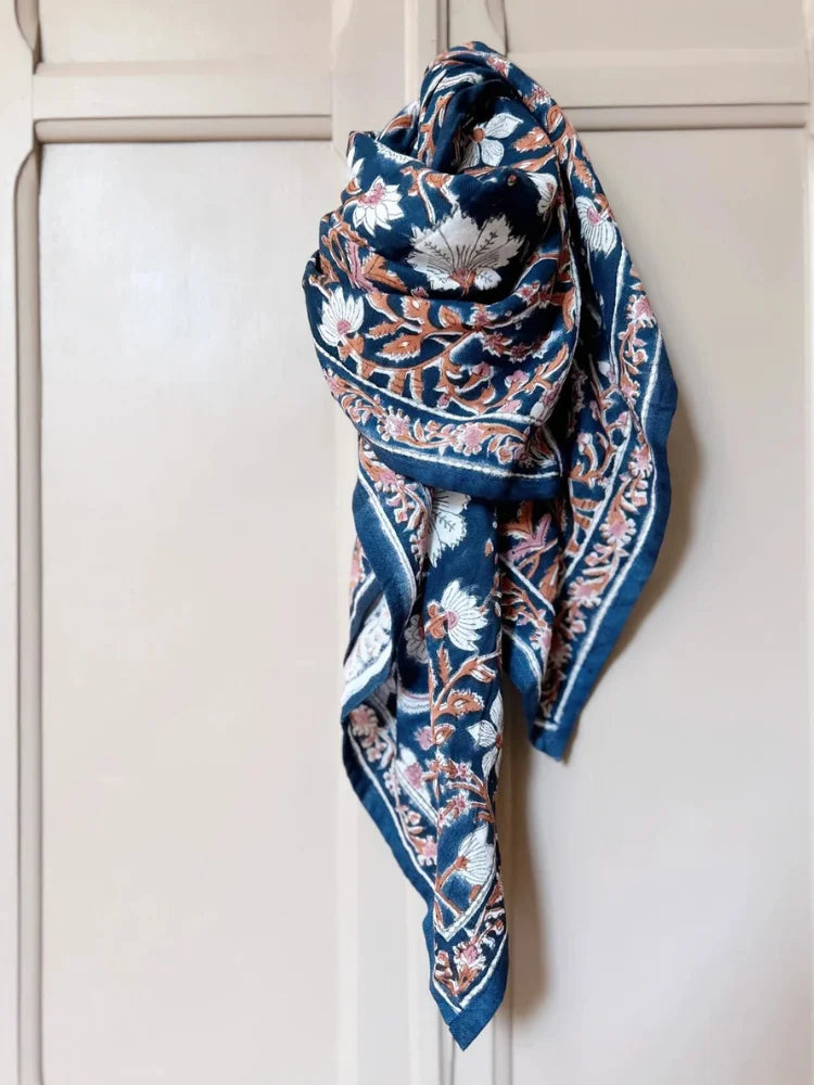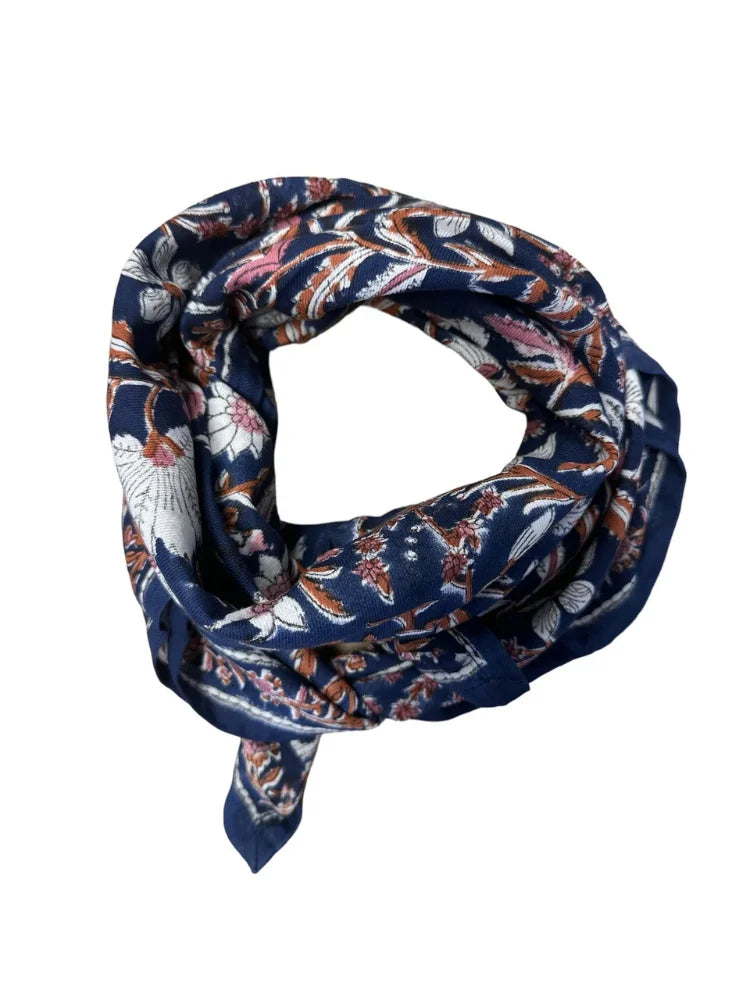 Plongez dans la douceur des nuits étoilées avec le foulard Delhi Minuit de chez So Family. Avec son bleu profond et ses motifs floraux sur 100x100 cm, ce foulard est un hommage aux nuances magiques de la nuit...