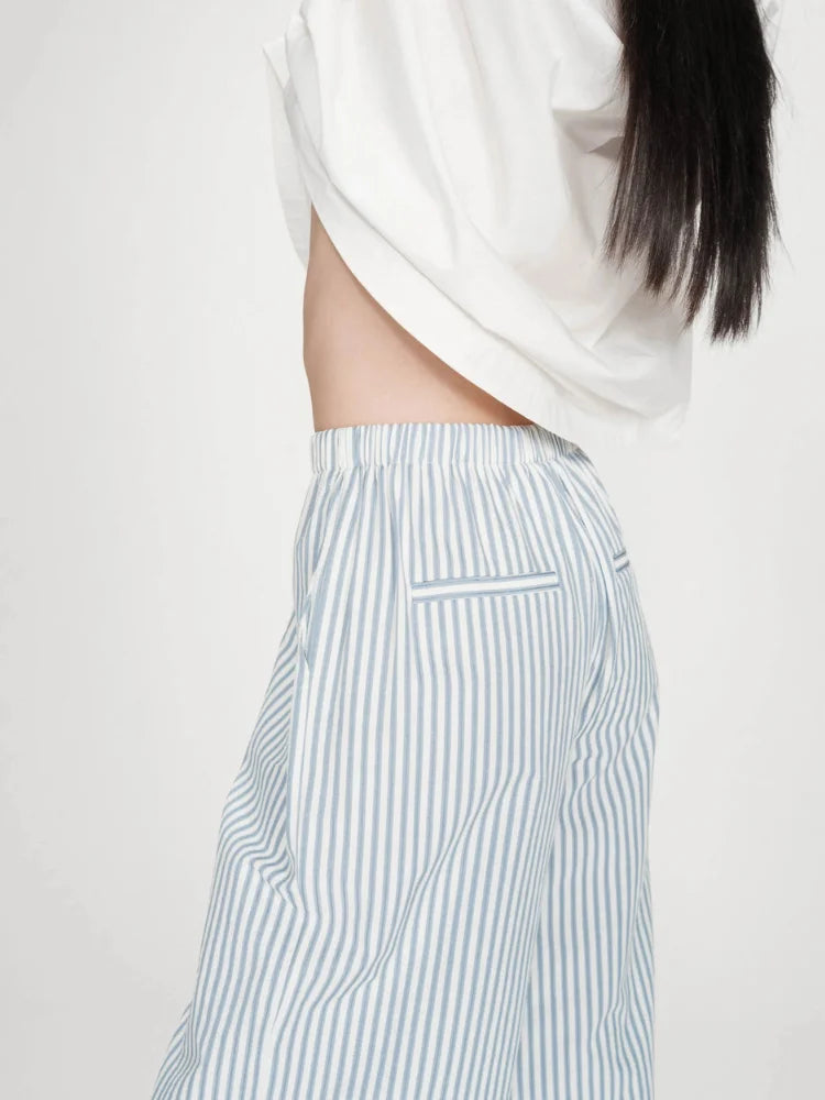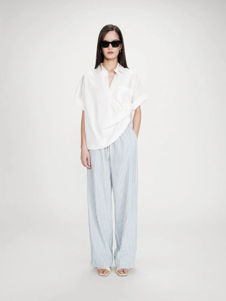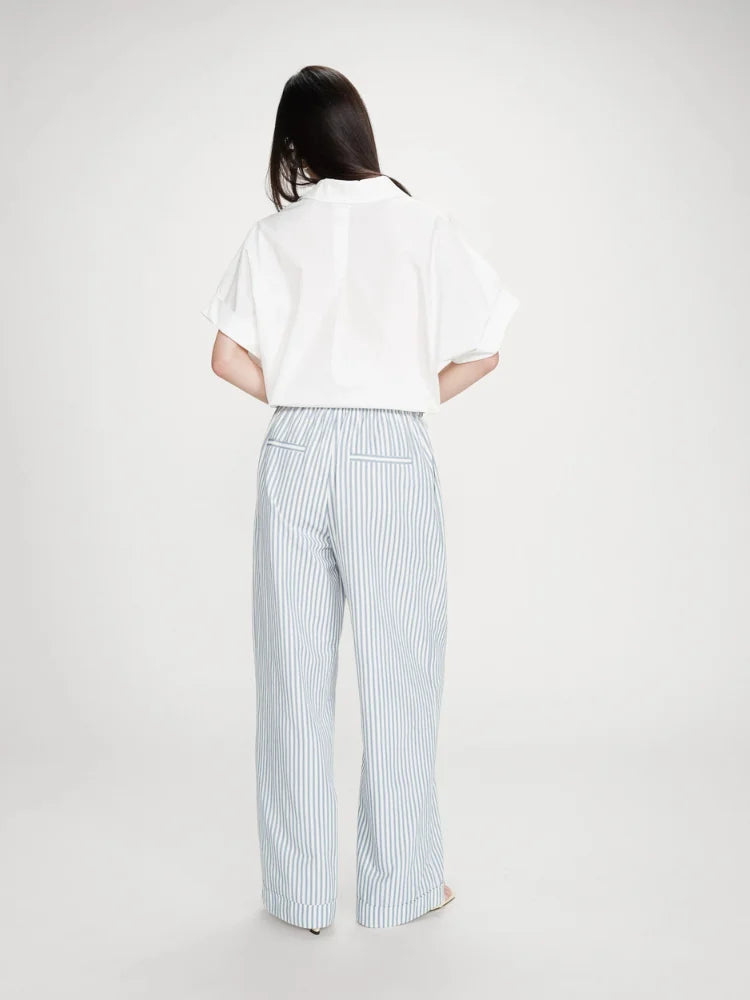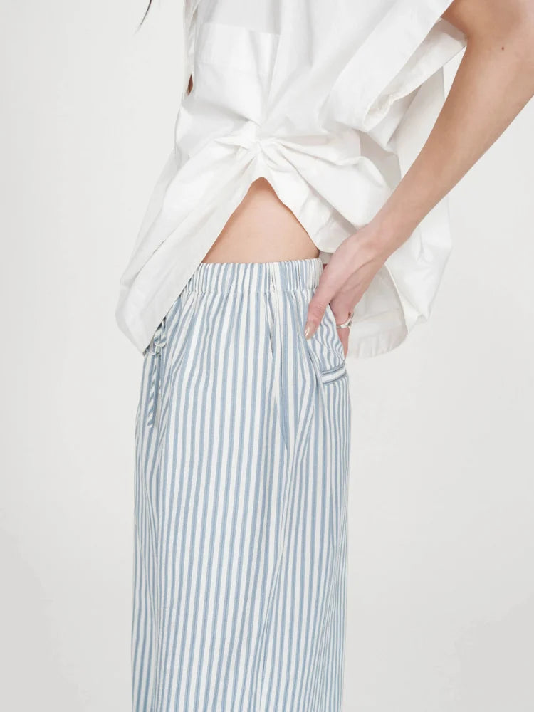 Le pantalon Volute de chez Grace & Mila invite l'été dans le vestiaire. Avec sa coupe droite et large et ses rayures bleuet délicates, il dessine une allure élancée, légère, presque évidente. C'est le genre de pièce qu'on adopte dès les beaux jours, pour sa facilité autant que pour son style.