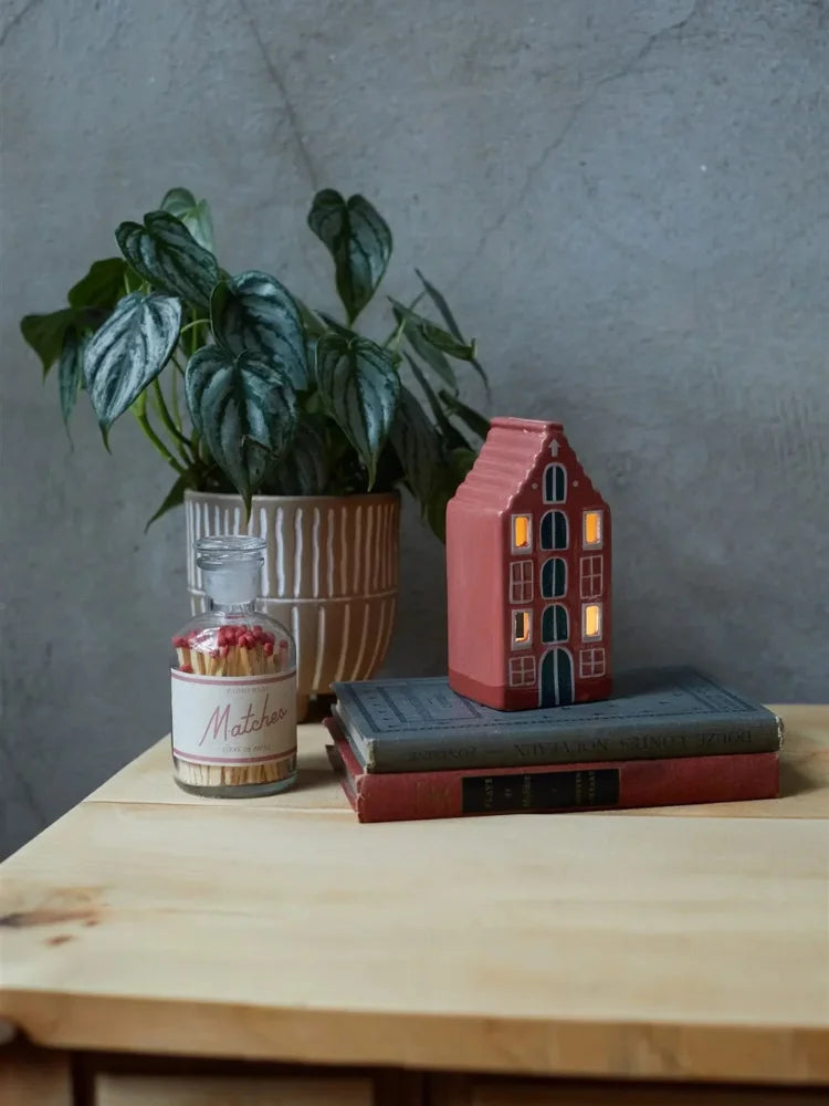 Conçue en céramique artisanale, peinte à la main avec des détails tendres, cette petite maison rose cache une double fonction : elle accueille un cône d'encens ou une bougie chauffe-plat, selon l'envie du moment. Le parfum Palo Santo, doux et boisé, s'échappe discrètement par les fenêtres illuminées, comme si quelqu'un était à la maison, là-bas, derrière les volets.