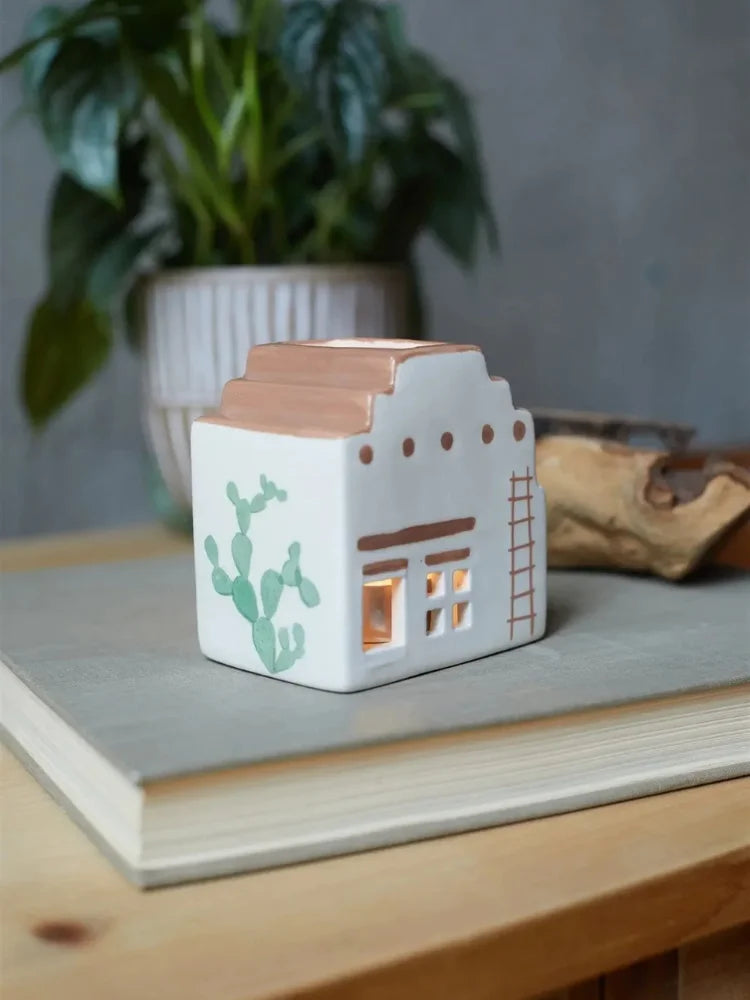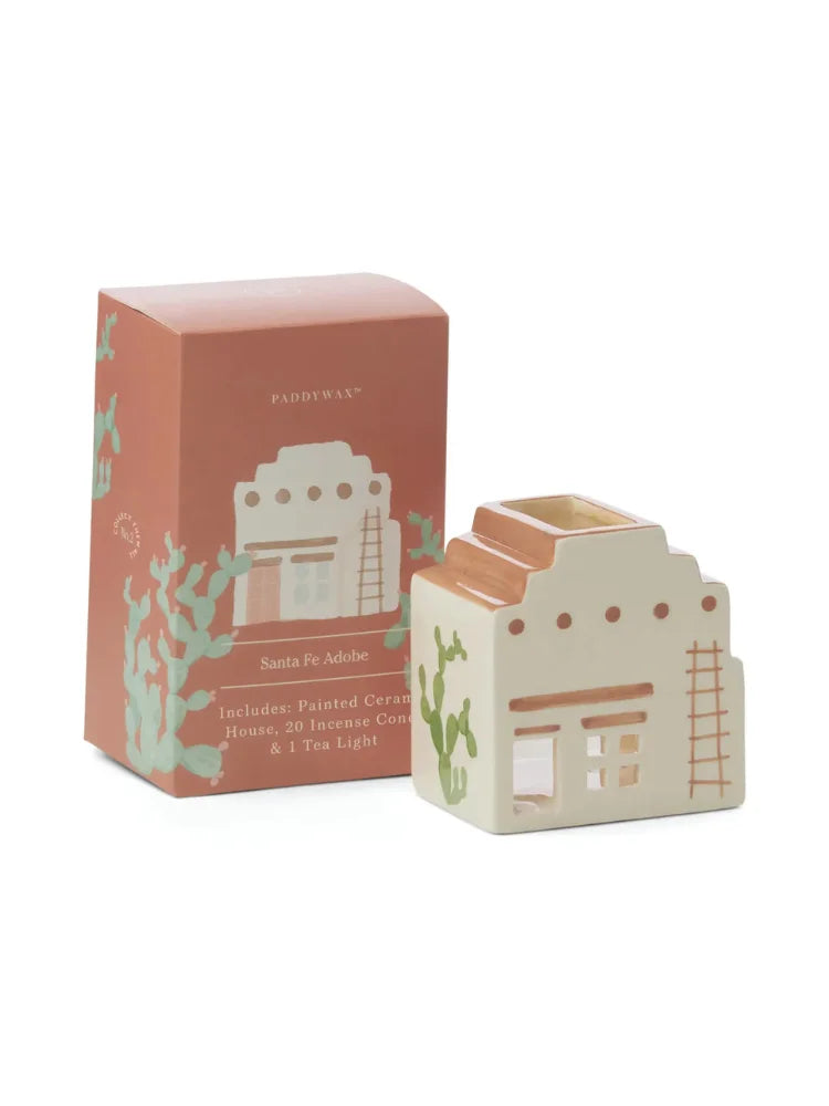 Bienvenue dans le Nouveau-Mexique rêvé. Avec ses murs blancs, ses toits en escalier et ses cactus stylisés, L'Adobe de Santa Fe est une maison miniature inspirée des architectures adobe du Sud-Ouest américain. Conçue en céramique et peinte à la main, elle cache en son coeur un petit rituel sacré : l'allumage d'un cône d'encens ou d'une bougie.