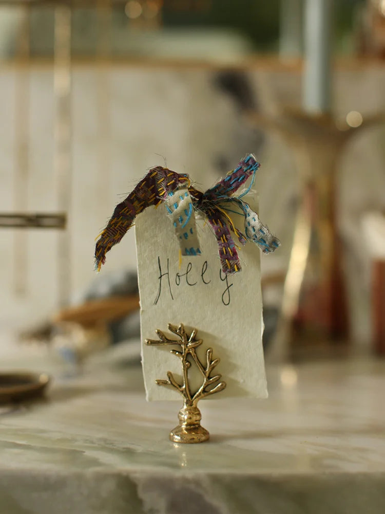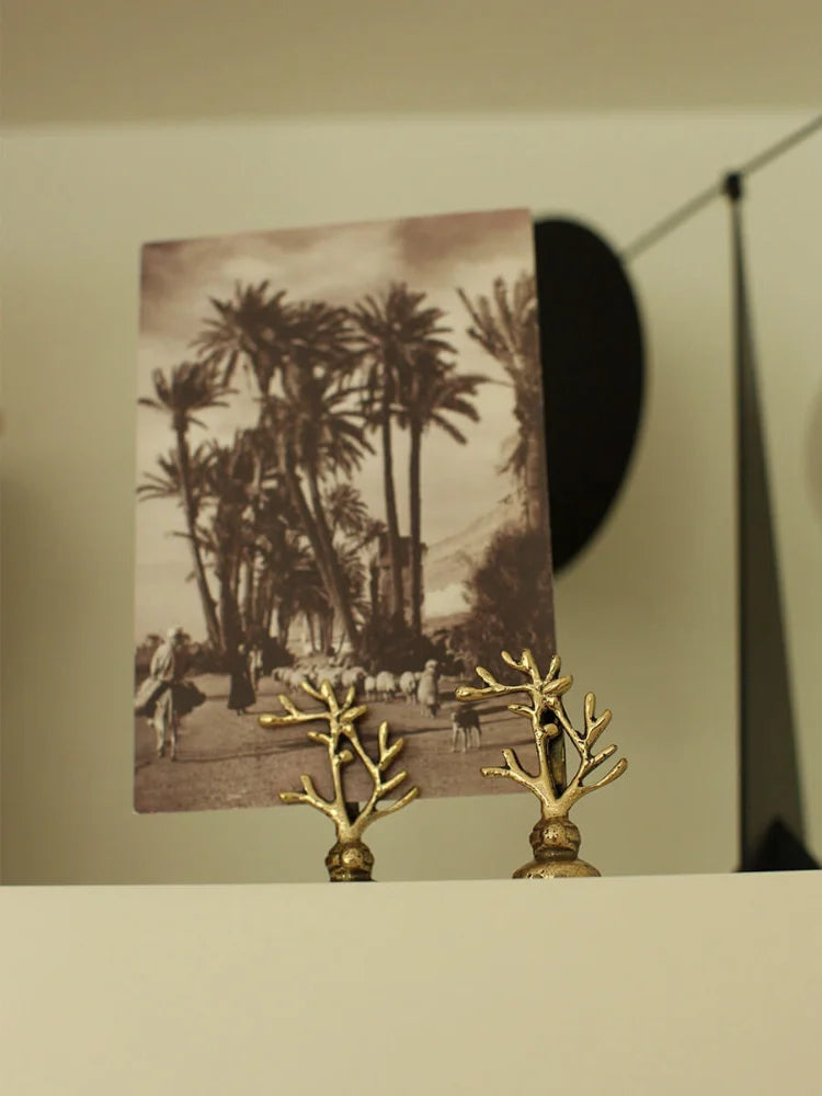 Fabriqué à la main en Inde en laiton recyclé, chaque porte-mémo révèle de subtiles irrégularités qui racontent le geste artisanal. On aime son éclat légèrement patiné, capable d'apporter une touche chaleureuse et singulière à une décoration contemporaine ou plus bohème.