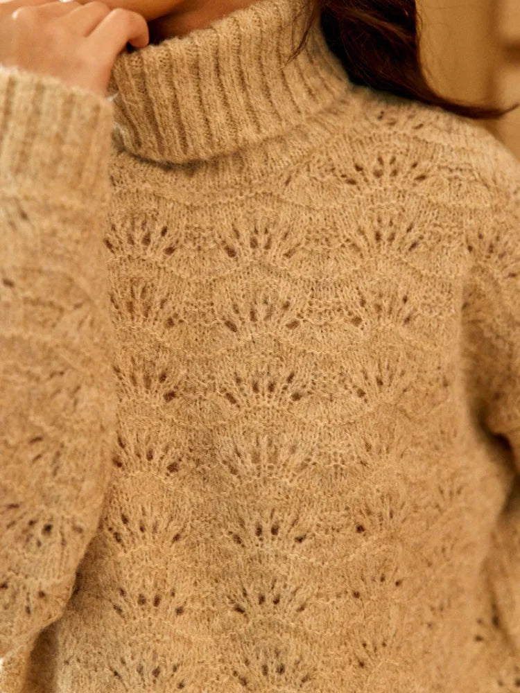 Le pull Madison de La Petite Étoile incarne cette élégance simple qui réchauffe autant le coeur que les épaules. Tricoté dans un point fantaisie ajouré, il dévoile une texture délicate et féminine, subtilement rétro. Sa coupe droite et longue tombe avec naturel, tandis que son col roulé promet chaleur et confort pour les journées fraîches.