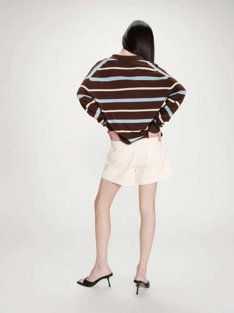 Le pull Vaporetto de chez Grace & Mila revisite le polo avec une nonchalance étudiée. Une coupe oversize qui tombe juste, un jeu de rayures gourmandes chocolat et bleu ciel, et une maille douce qui invite au mouvement. C'est le genre de pièce qu'on enfile sans y penser, mais qui signe immédiatement une allure. Un pull à l'élégance décontractée, entre nostalgie seventies et modernité urbaine.