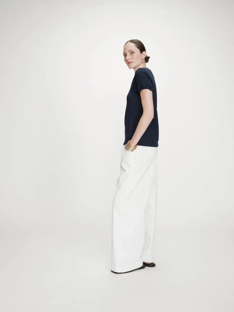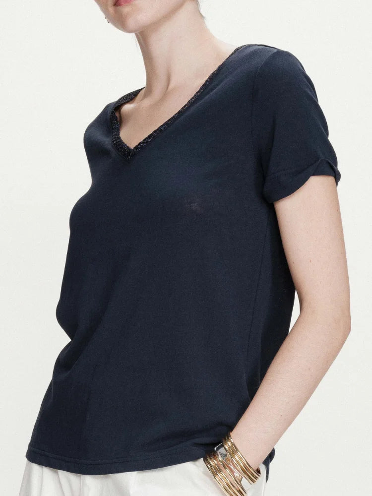 Le t-shirt Vasco de chez Grace & Mila est de ces pièces qu'on adopte sans hésiter. Une coupe droite bien pensée, une encolure en V flatteuse et ce bleu marine intemporel qui traverse les saisons sans jamais se lasser. Simple, oui, mais jamais banal.