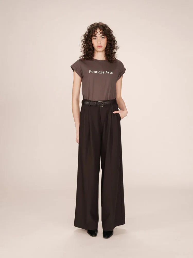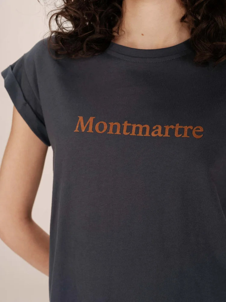 Sous le tweed, un trench fluide ou un tailleur large, Sorentino de chez Grace & Mila dépose sa touche iconique : un message en velours qui célèbre Paris. Décliné en ivoire, marine, châtaigne et beige, ce t-shirt 100% coton épouse la saison avec une coupe droite, des manches roulottées et une encolure ronde au tombé net.