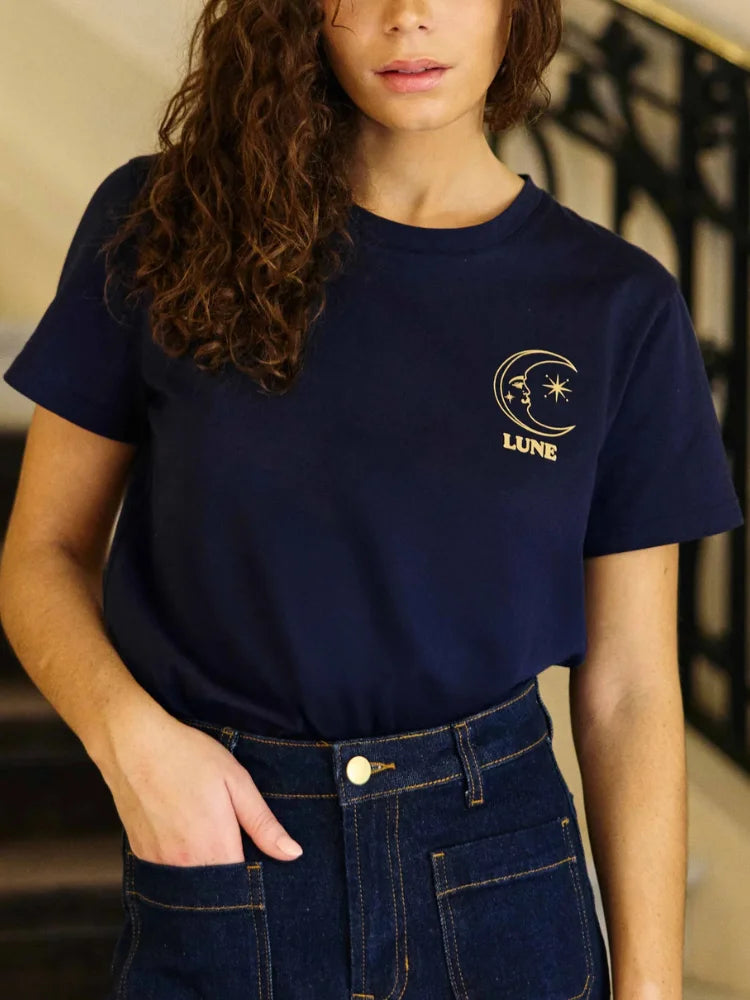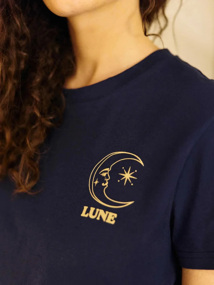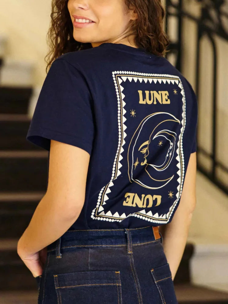 Un t-shirt qui parle doucement, mais qui dit beaucoup. Toon, c'est cette pièce facile qu'on enfile sans réfléchir, et qui tombe toujours juste. Une lune dessinée comme un talisman, devant et dans le dos, pour accompagner les journées ordinaires et les soirs un peu plus rêveurs.