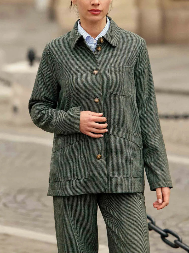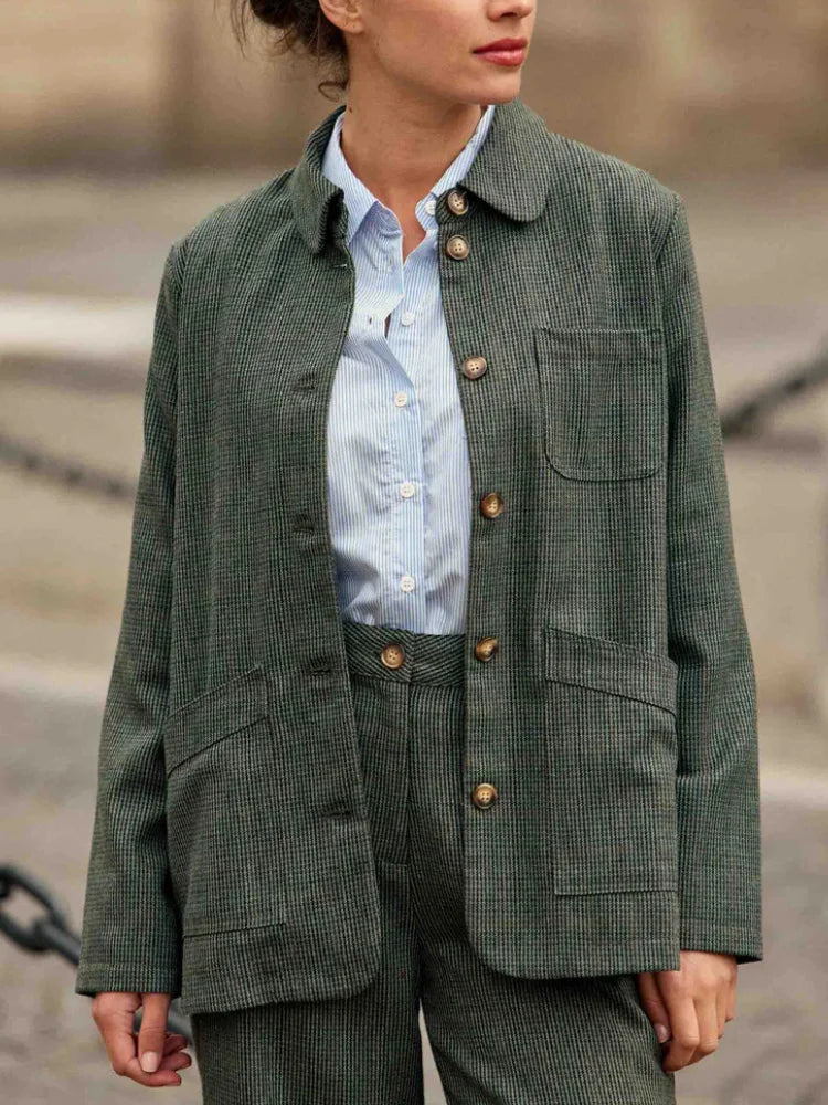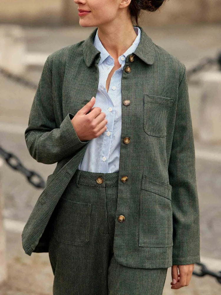 Faulina, c'est cette silhouette droite mais décontractée, ce col classique un peu rétro, ces boutons presque joailliers. À porter ouverte sur une chemise, ou fermée façon uniforme chic. Et pour celles qui aiment les total looks assumés : le combo avec la pantalon Atlany est vivement conseillé !